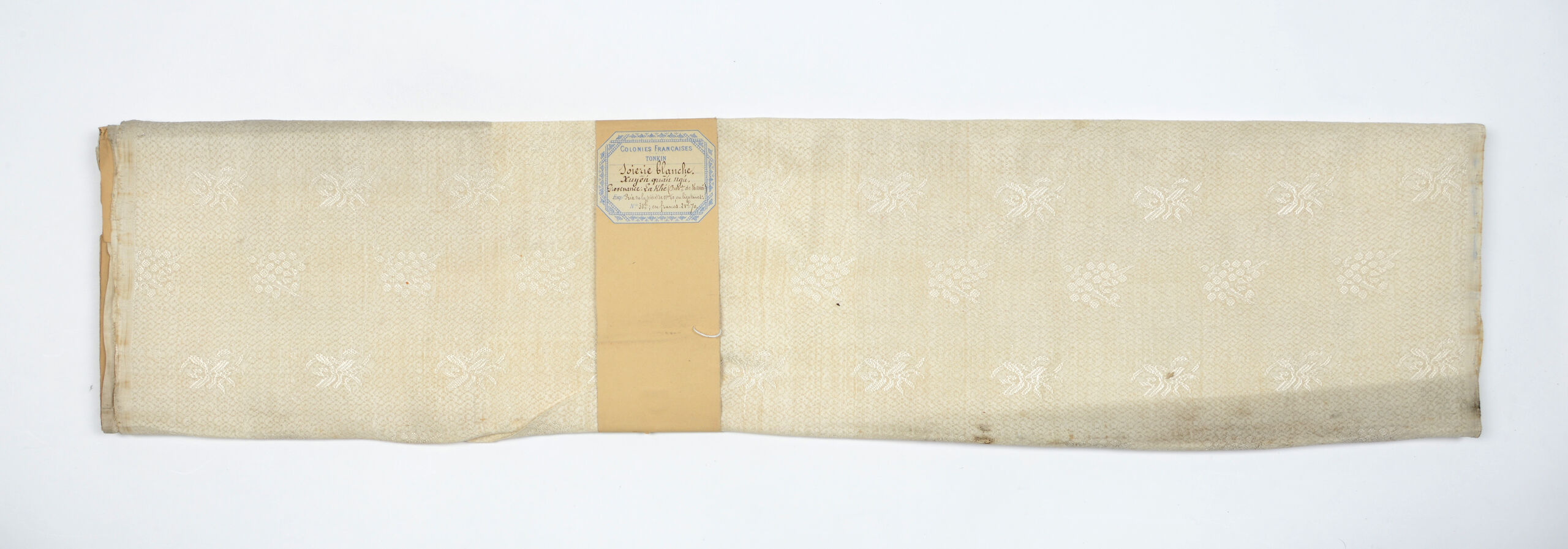 - label (front) : COLONIES FRANÇAISES | TONKIN | Soierie blanche. | Xuye´n qua´n ngú. [?] | Provenance: La Khé (Prov ͨ ͤ de Hanoi) | Prix de la piéce de 11 m 60 en ligatures: | 31 l ; en francs 21 f 70.