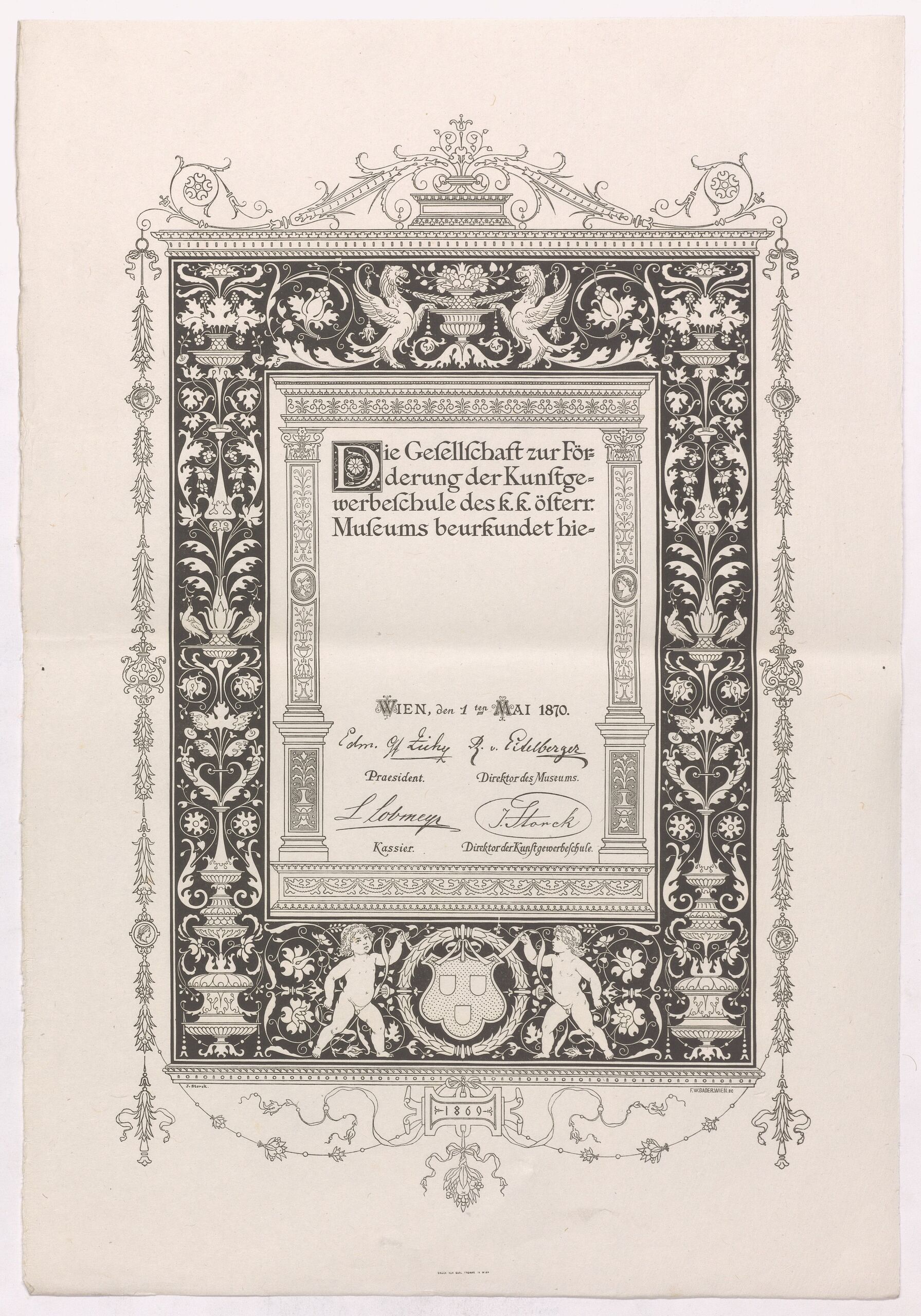 - text on object: Die Gesellschaft zur För- / derung der Kunstge- / werbeschule des k. k. österr. / Museums beurkundet hie- / Wien, den 1 ten Mai 1870. / Edm. Gf. Zicky R. v. Eitelberger / Praesident. Direktor des Museums. / L Lobmeyr J. Storck / Kassier. Direktor des Kunstgewerbeschule / J. Storck / F. W. Bader Wien sc. / 1869 / Druck von Carl Fromme in Wien [gedruckter Text]