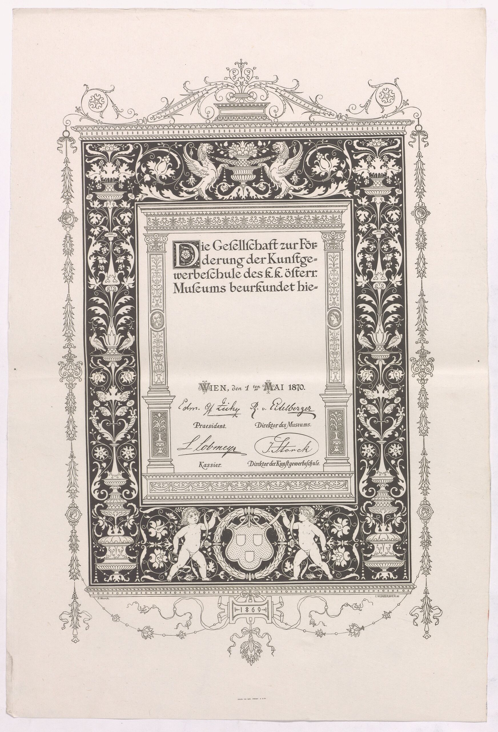 - text on object: Die Gesellschaft zur För- / derung der Kunstge- / werbeschule des k. k. österr. / Museums beurkundet hie- / Wien, den 1 ten Mai 1870. / Edm. Gf. Zicky R. v. Eitelberger / Praesident. Direktor des Museums. / L Lobmeyr J. Storck / Kassier. Direktor des Kunstgewerbeschule / J. Storck / F. W. Bader Wien sc. / 1869 / Druck von Carl Fromme in Wien [gedruckter Text]