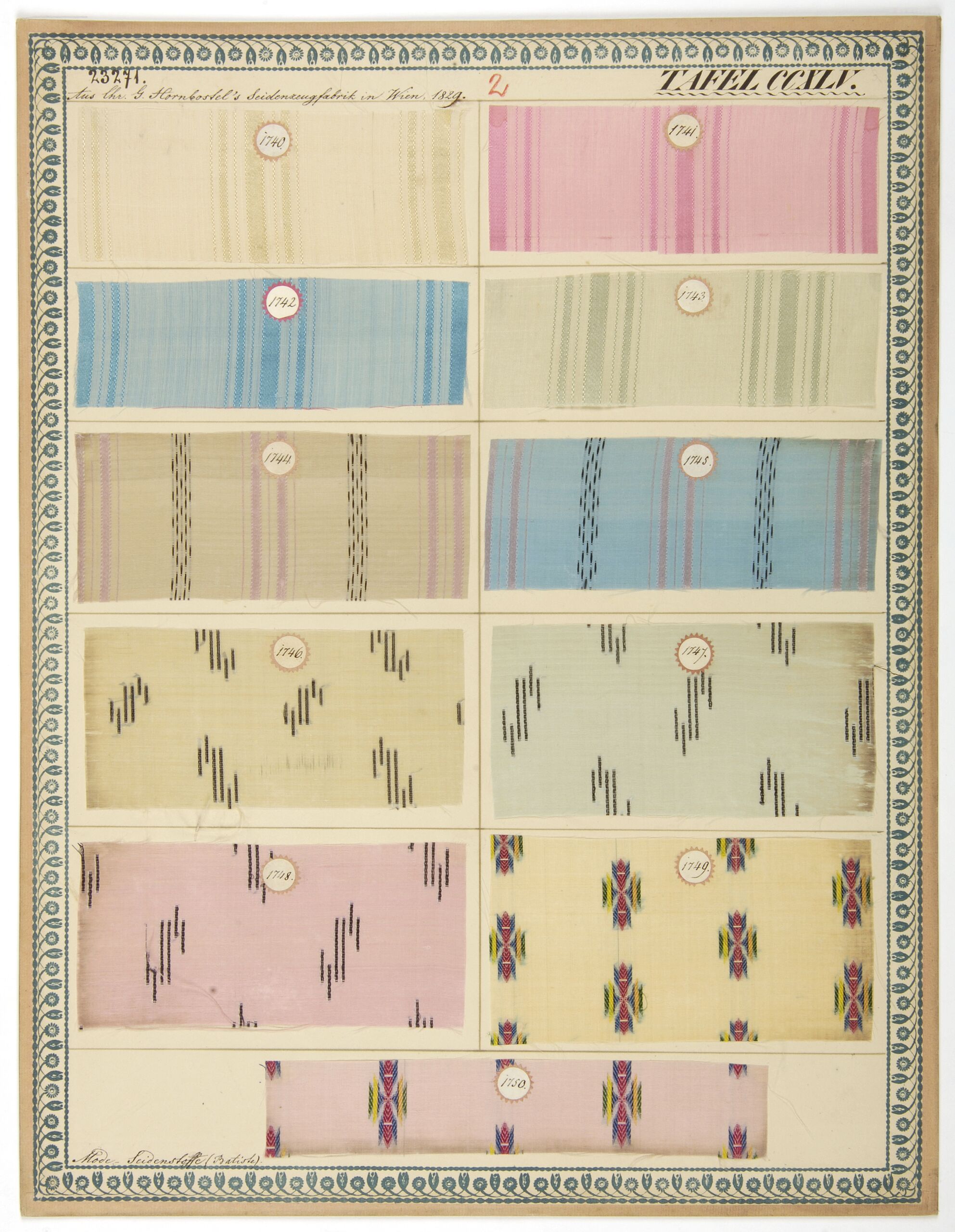 - label (front) : Aus Chr. G. Hornbostel's Seidenzeugfabrik in Wien, 1829. / Mode-Seidenstoffe (Batiste).