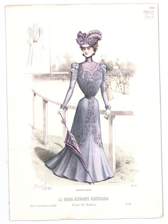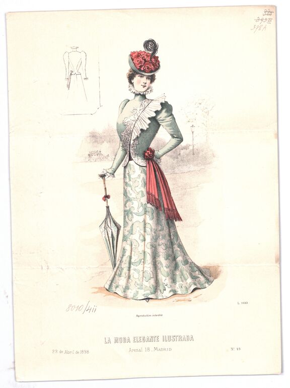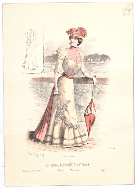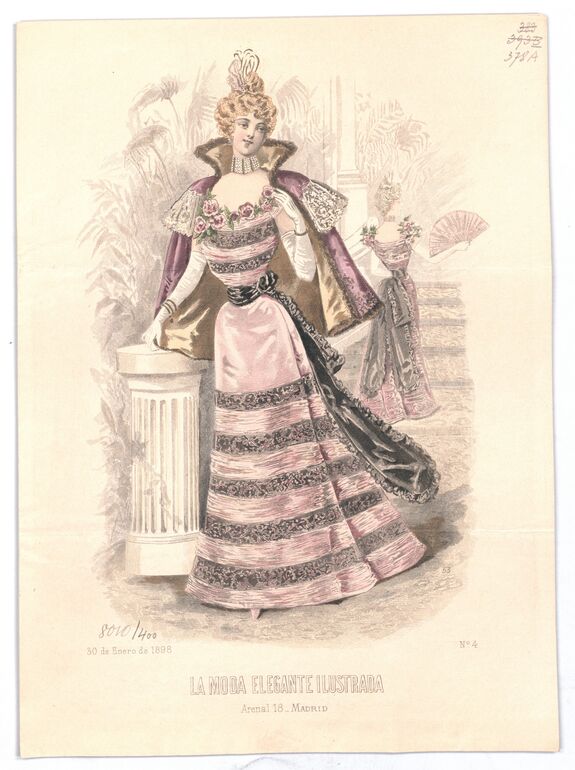 - text on object: 6 de Enero de 1894; Reproduction interdite. / LA MODA ELEGANTE ILUSTRADA / Alcalà 23 Madrid / Perfumeria de lujo Guerlain, 15, r. de la Paix, Paris. / Faja Regente Bté. y Corse Ana de Austria de Mon. de Vertus, 12, r. Auber, Paris.; N° 1 / Extraordinário.