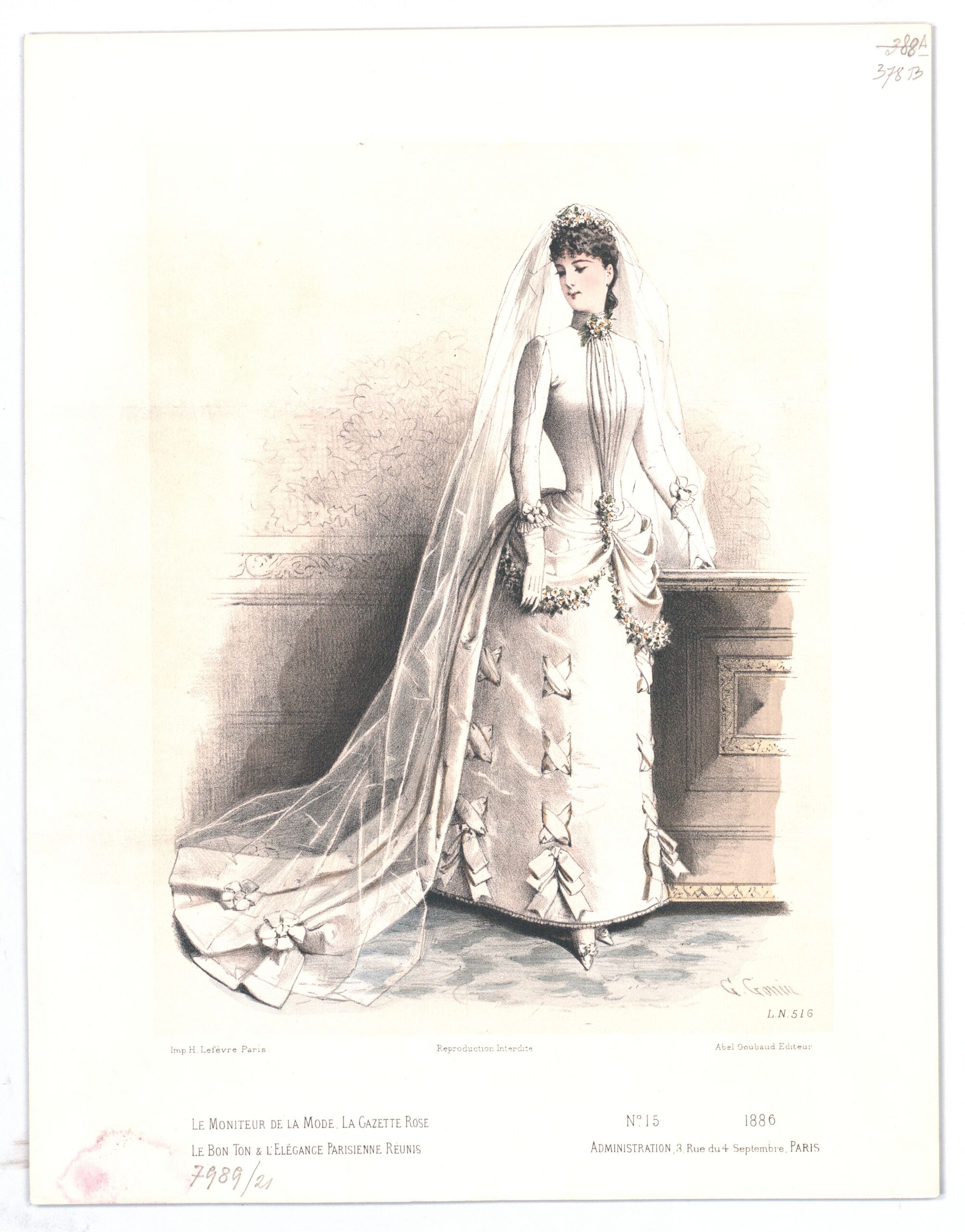 - text on object: G. Gonin; L. N 516; Imp H. Lefévre Paris; Reproduction Interdite; Abel Goubaud Editeur; Le Moniteur de la Mode, la gazette rose / le bon ton & l'elégance parisienne réunis; N° 15 1886 / Administration, / 3, Rue du 4 Septembre, PARIS