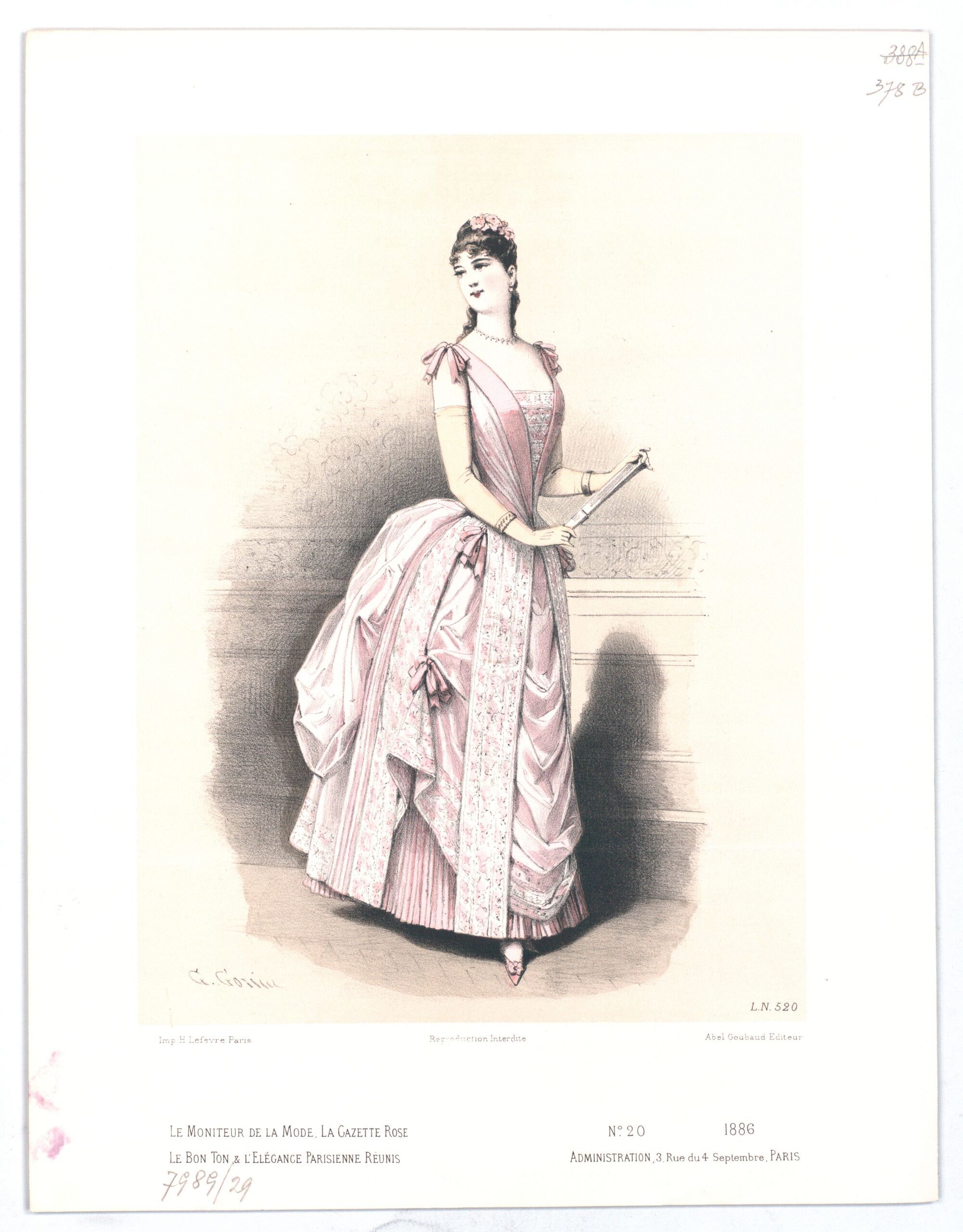 - text on object: G. Gonin; L. N 520; Imp H. Lefévre Paris; Reproduction Interdite; Abel Goubaud Editeur; Le Moniteur de la Mode, la gazette rose / le bon ton & l'elégance parisienne réunis; N° 20 1886 / Administration, / 3, Rue du 4 Septembre, PARIS