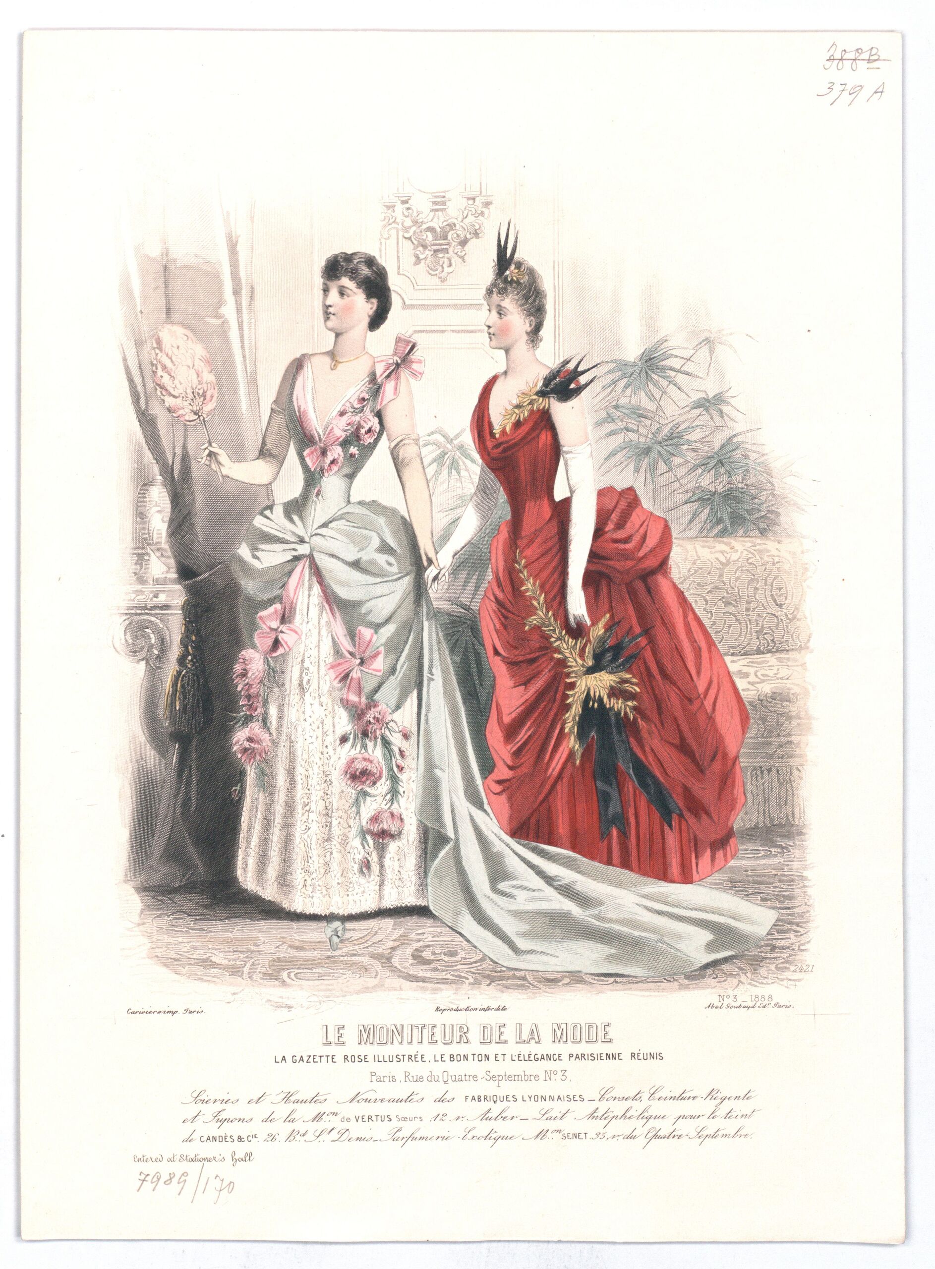 - text on object: 2421; Jules David; N° 3 1888; Lariviere imp. Paris; Reproduction Interdite; Abel Goubaud Ed. Paris; Le Moniteur de la Mode, la gazette rose le bon ton & l'elégance parisienne réunis; Paris. Rue du Quatre-Septembre. N° 3 / [...] / Entered at Stationer's Hall