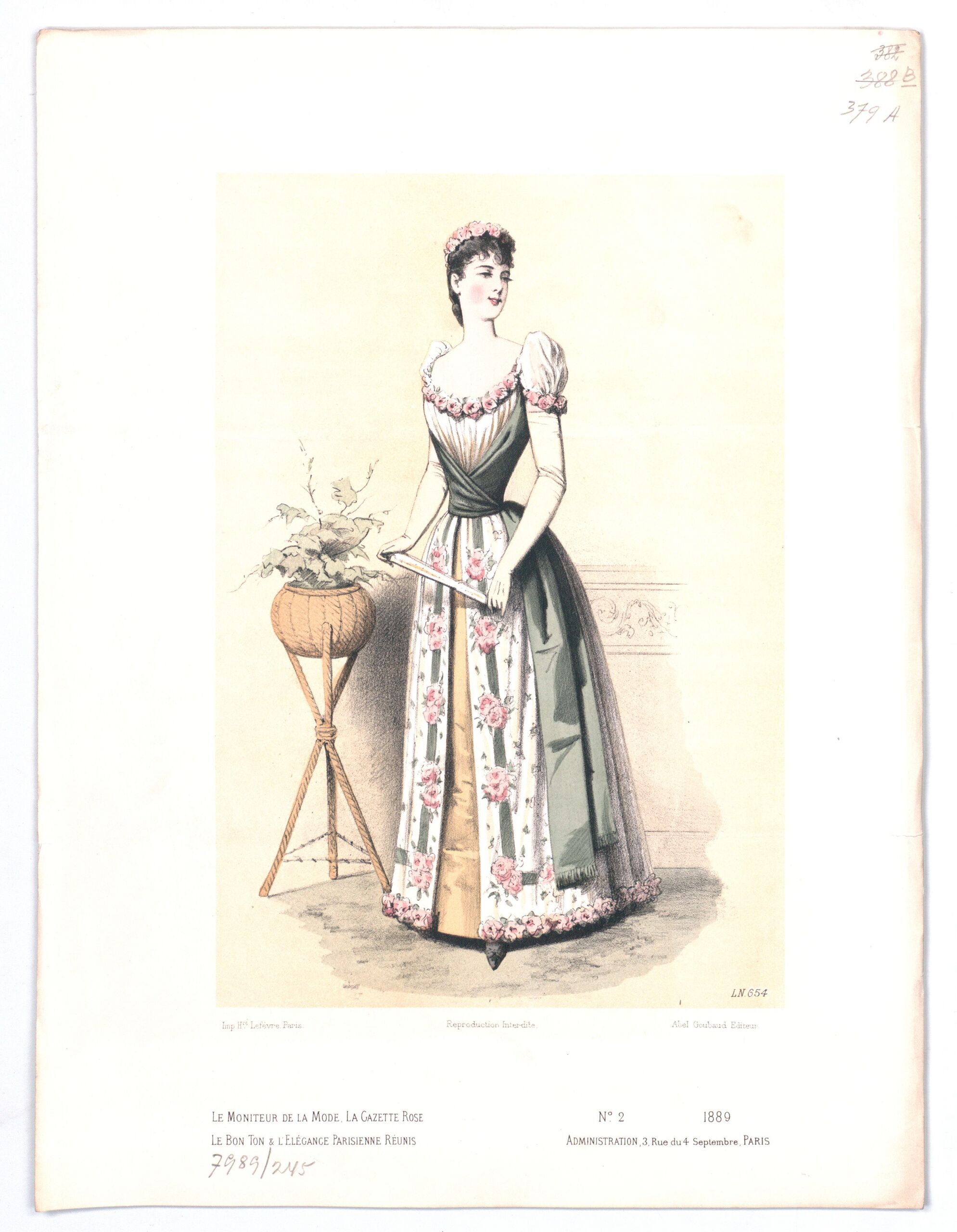 - text on object: LN 654; Imp H. Lefévre Paris; Reproduction Interdite; Abel Goubaud Editeur; Le Moniteur de la Mode, la gazette rose / le bon ton & l'elégance parisienne réunis; N° 2 1889 / Administration, / 3, Rue du 4 Septembre, PARIS