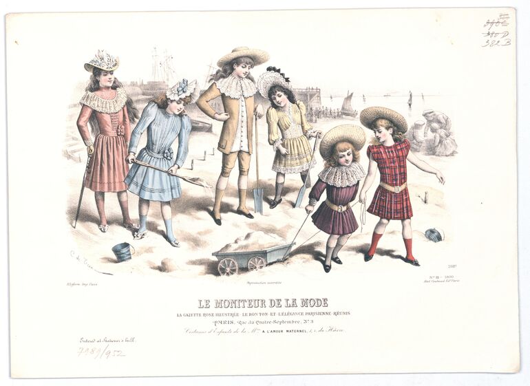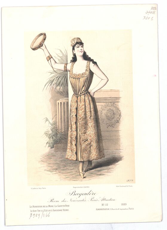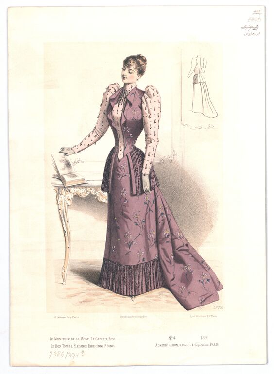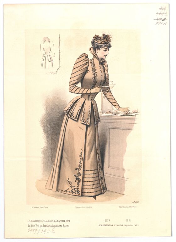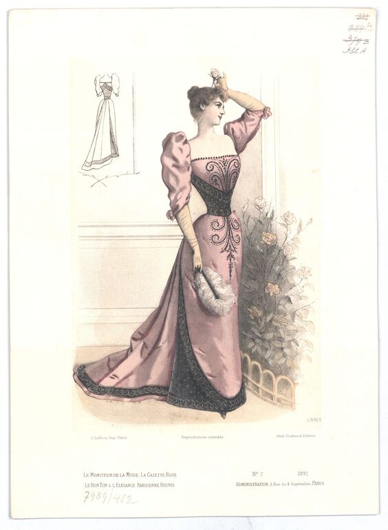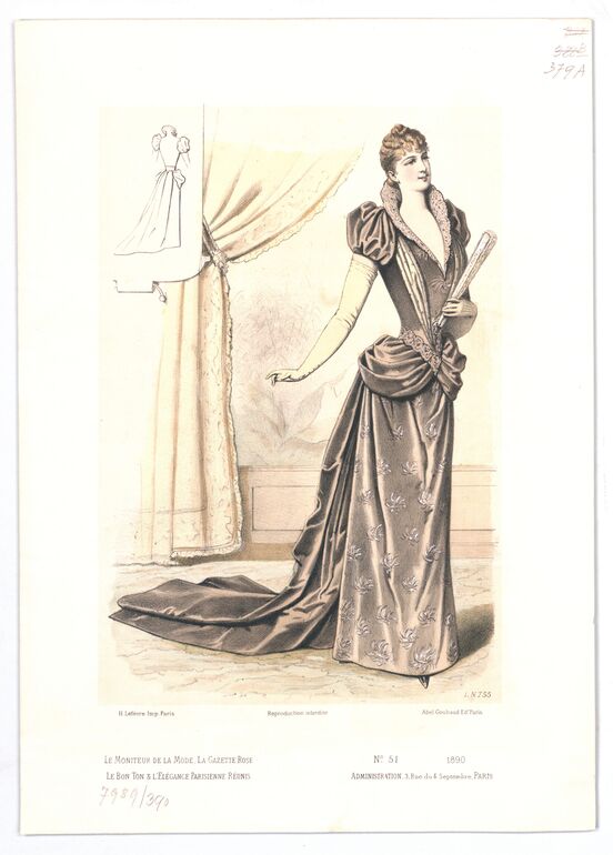 - text on object: LN 749; H. Lefévre. Imp. Paris; Reproduction Interdite; Abel Goubaud Editeur; Le Moniteur de la Mode, la gazette rose / le bon ton & l'elégance parisienne réunis; N° 45 1890 / Administration, / 3, Rue du 4 Septembre, PARIS