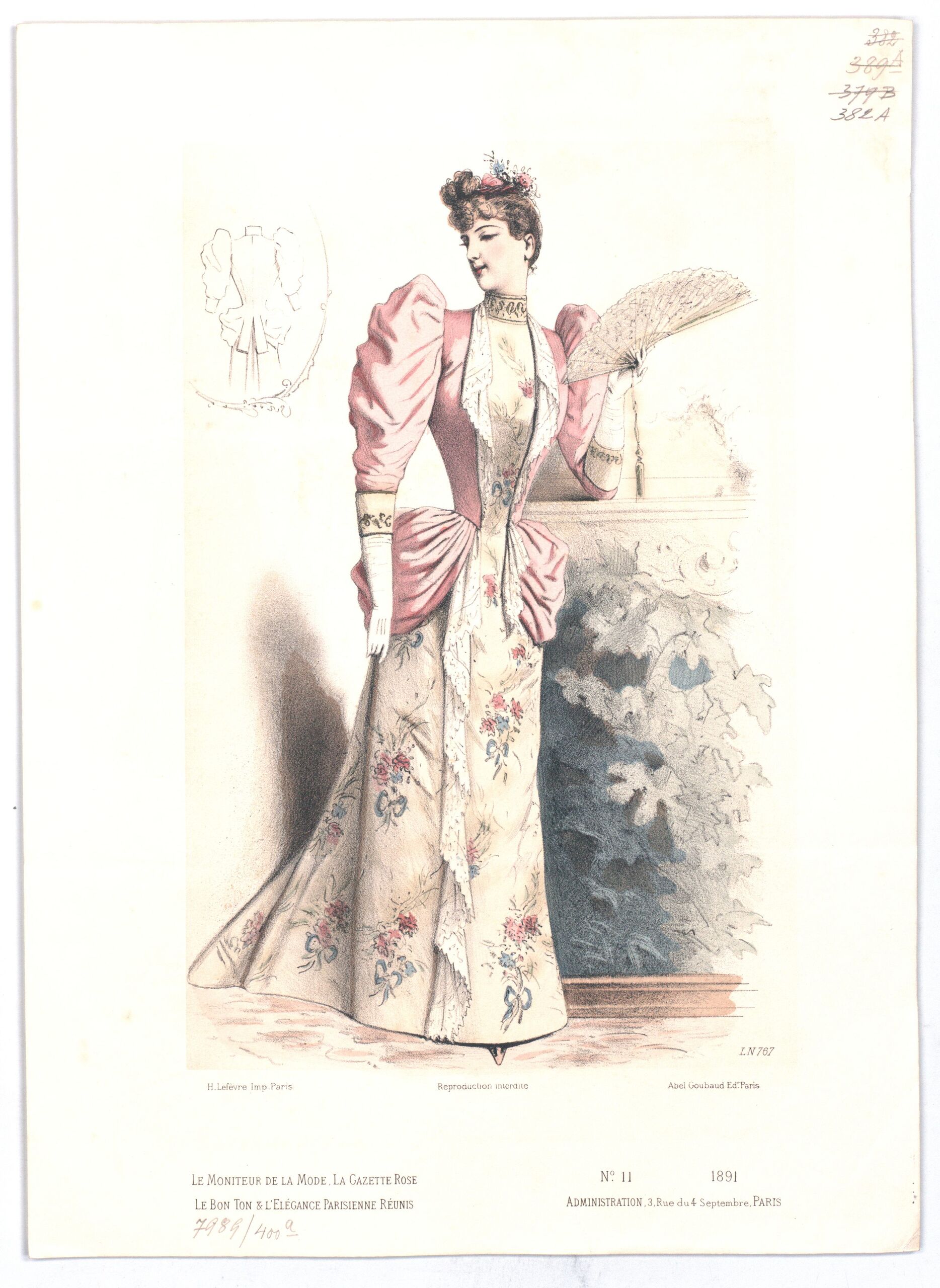 - text on object: LN 766; H. Lefévre. Imp. Paris; Reproduction Interdite; Abel Goubaud Editeur; Le Moniteur de la Mode, la gazette rose / le bon ton & l'elégance parisienne réunis; N° 10 1891 / Administration, / 3, Rue du 4 Septembre, PARIS