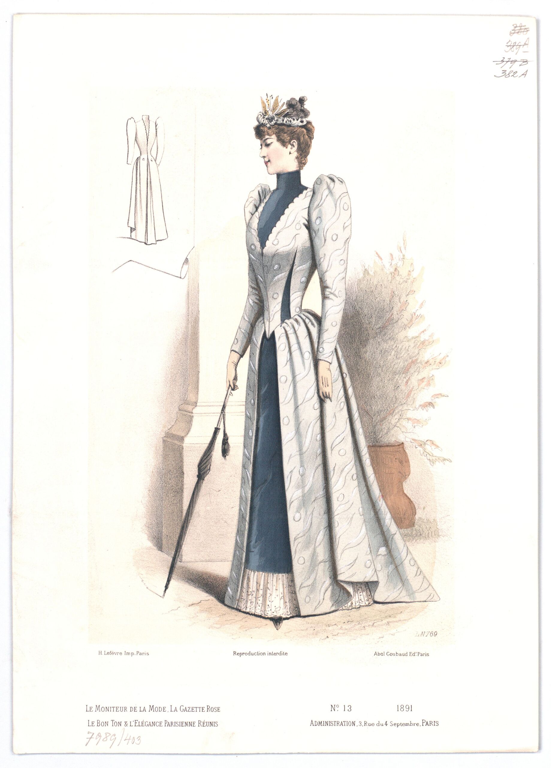- text on object: LN 769; H. Lefévre. Imp. Paris; Reproduction Interdite; Abel Goubaud Editeur; Le Moniteur de la Mode, la gazette rose / le bon ton & l'elégance parisienne réunis; N° 13 1891 / Administration, / 3, Rue du 4 Septembre, PARIS