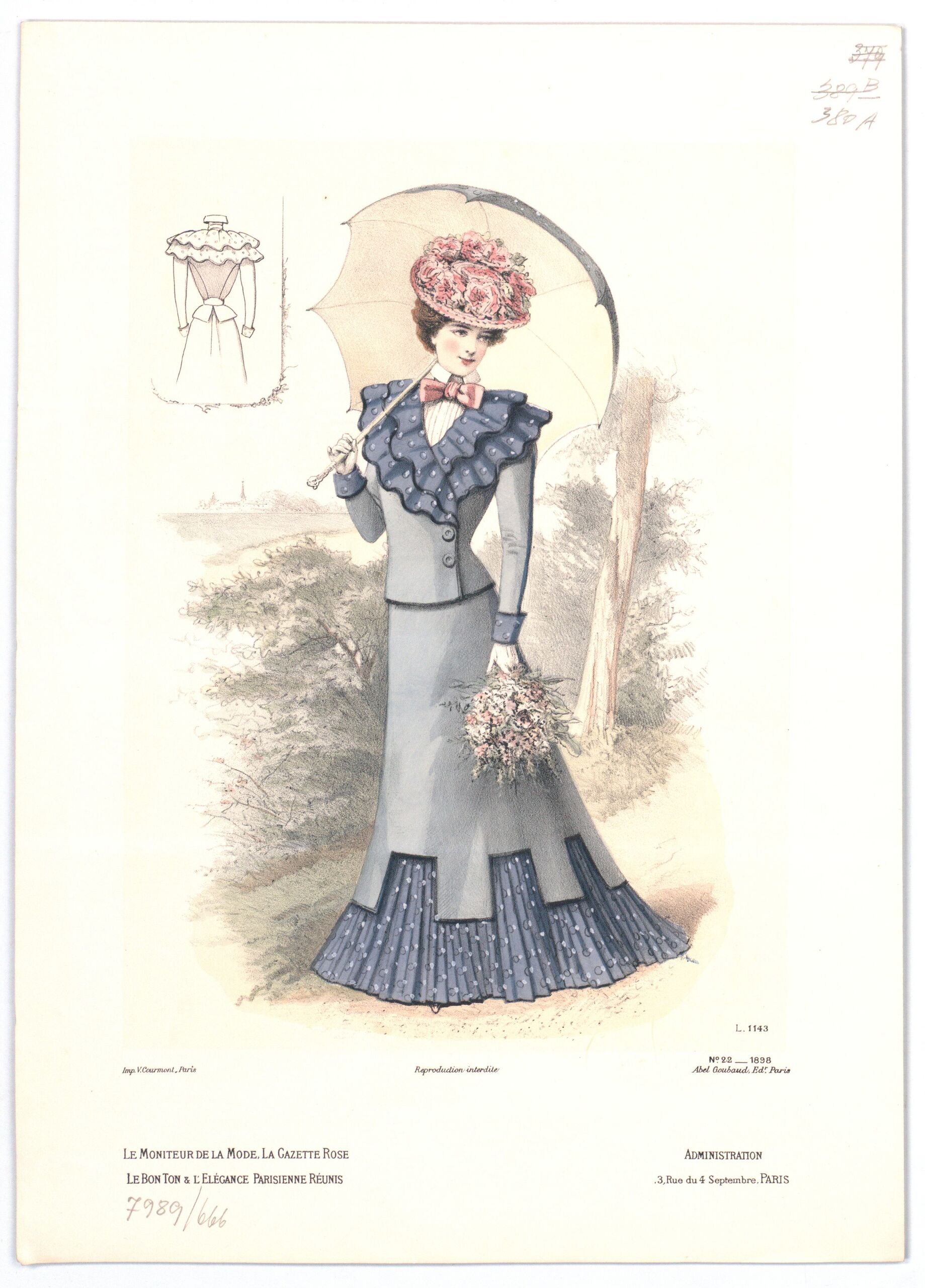 - text on object: L 1143; N° 22 1898; Imp. V. Courmont, Paris; Reproduction Interdite; Abel Goubaud Ed. Paris; Le Moniteur de la Mode, la gazette rose / le bon ton & l'elégance parisienne réunis; Administration, / 3, Rue du 4 Septembre, PARIS