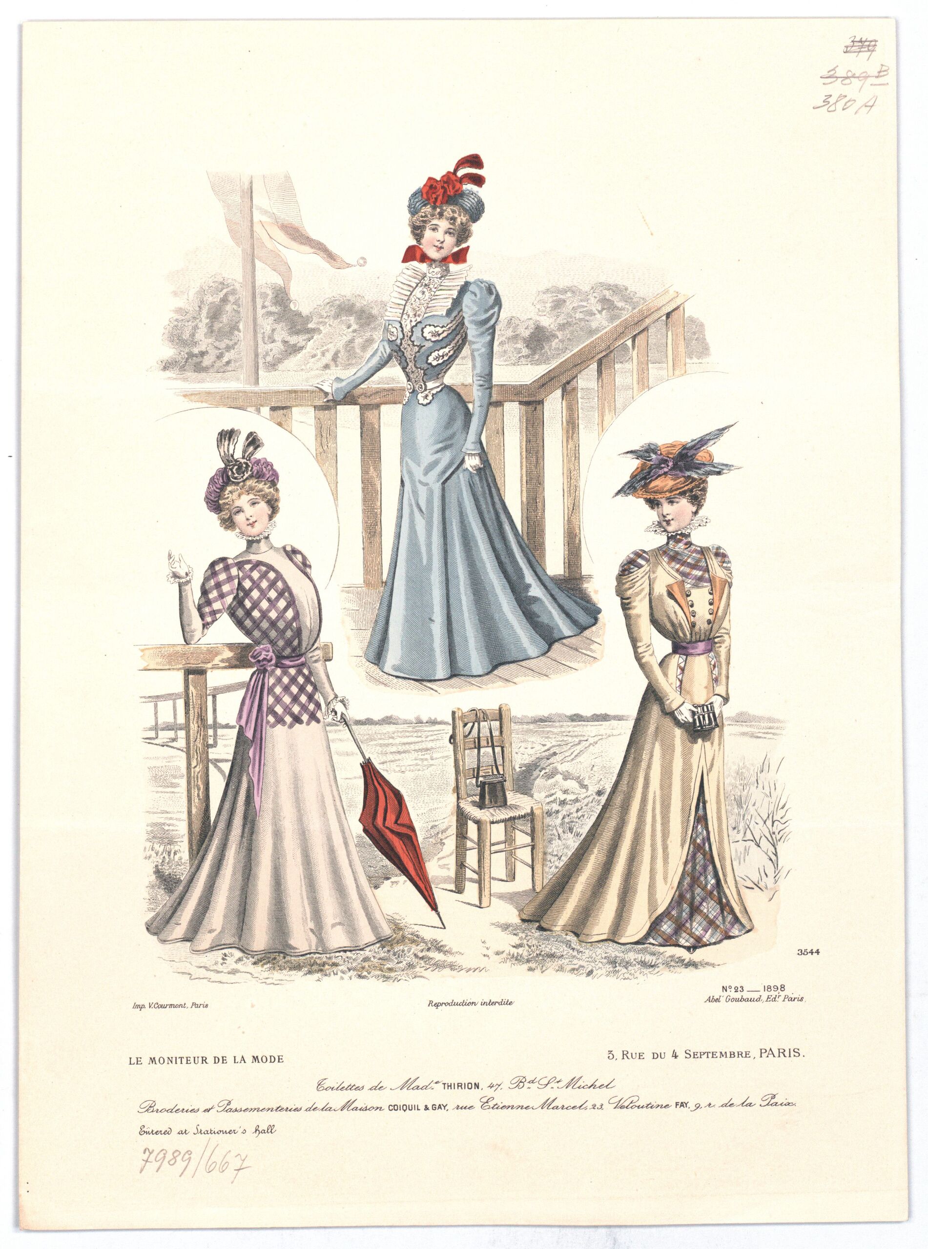 - text on object: 3544; N° 23 1898; Imp. V. Courmont, Paris; Reproduction Interdite; Abel Goubaud Ed. Paris; Le Moniteur de la Mode; 3, RUE DU 4 SEPTEMBRE, PARIS / [...] / Entered at Stationer's Hall