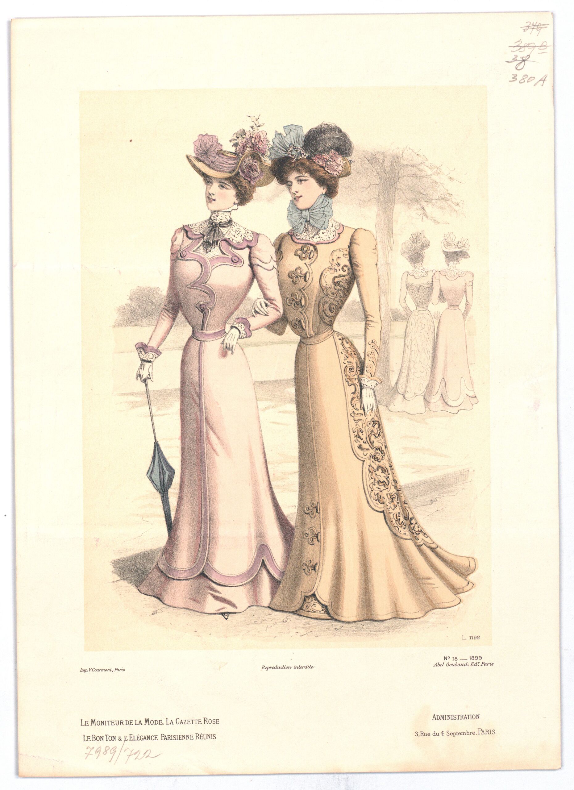- text on object: L 1192; N° 18 1899; Imp. V. Courmont, Paris; Reproduction Interdite; Abel Goubaud Ed. Paris; Le Moniteur de la Mode, la gazette rose / le bon ton & l'elégance parisienne réunis; Administration / 3, Rue du 4 Septembre, PARIS
