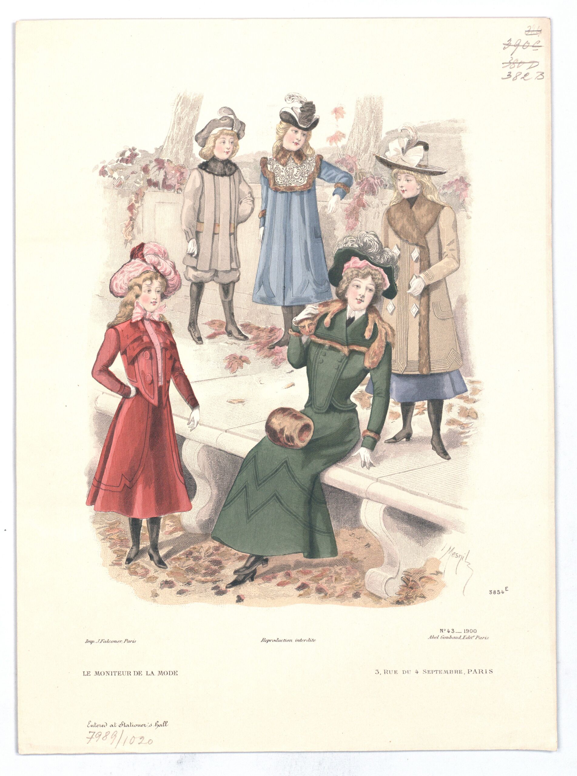 - text on object: L. Mesnil; 3854 E; N° 43 1900; Imp. J. Falconer, Paris; Reproduction Interdite; Abel Goubaud Edit. Paris; Le Moniteur de la Mode; 3, Rue du 4 Septembre, paris / [...] / Entered at Stationer's Hall