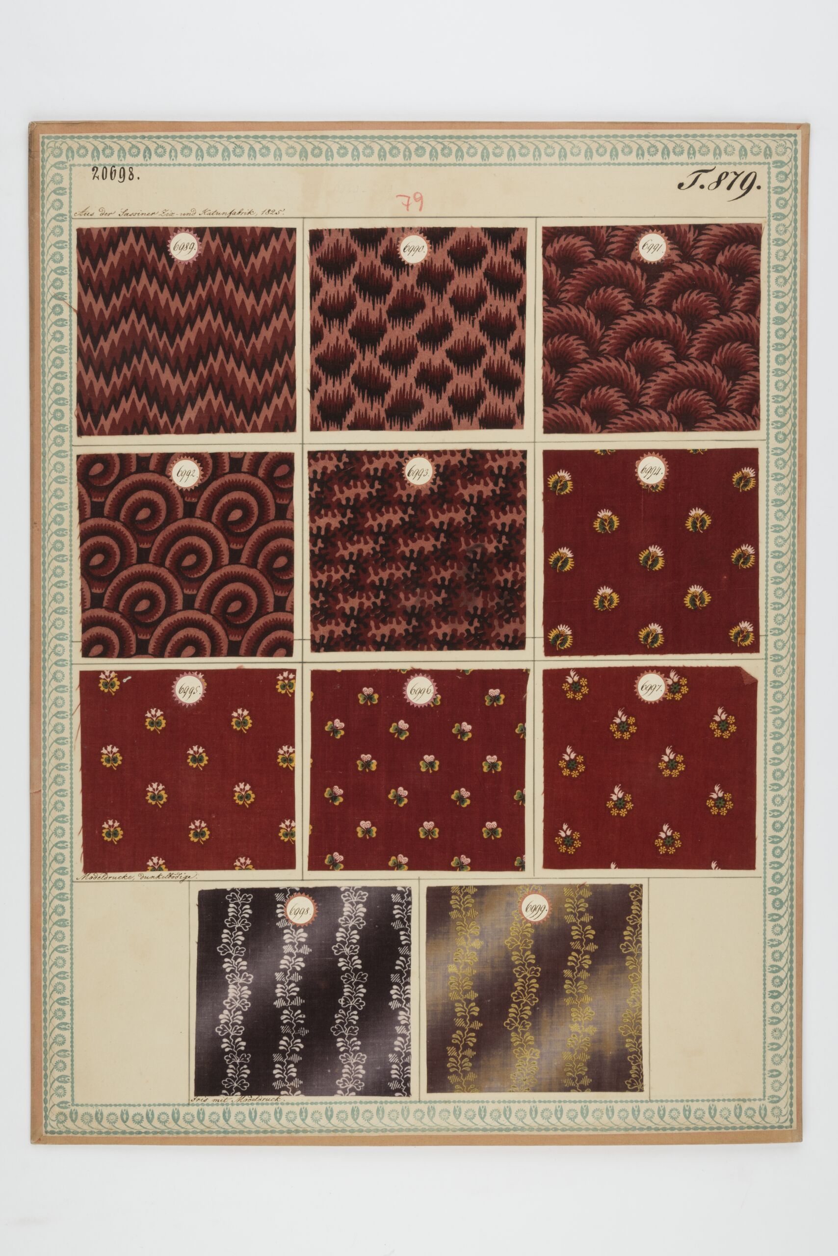 - label (front) : Aus der Sassiner Ziz- und Kattunfabrik, 1825. / Modeldrucke, dunkelbödige. / Iris mit Modeldruck.