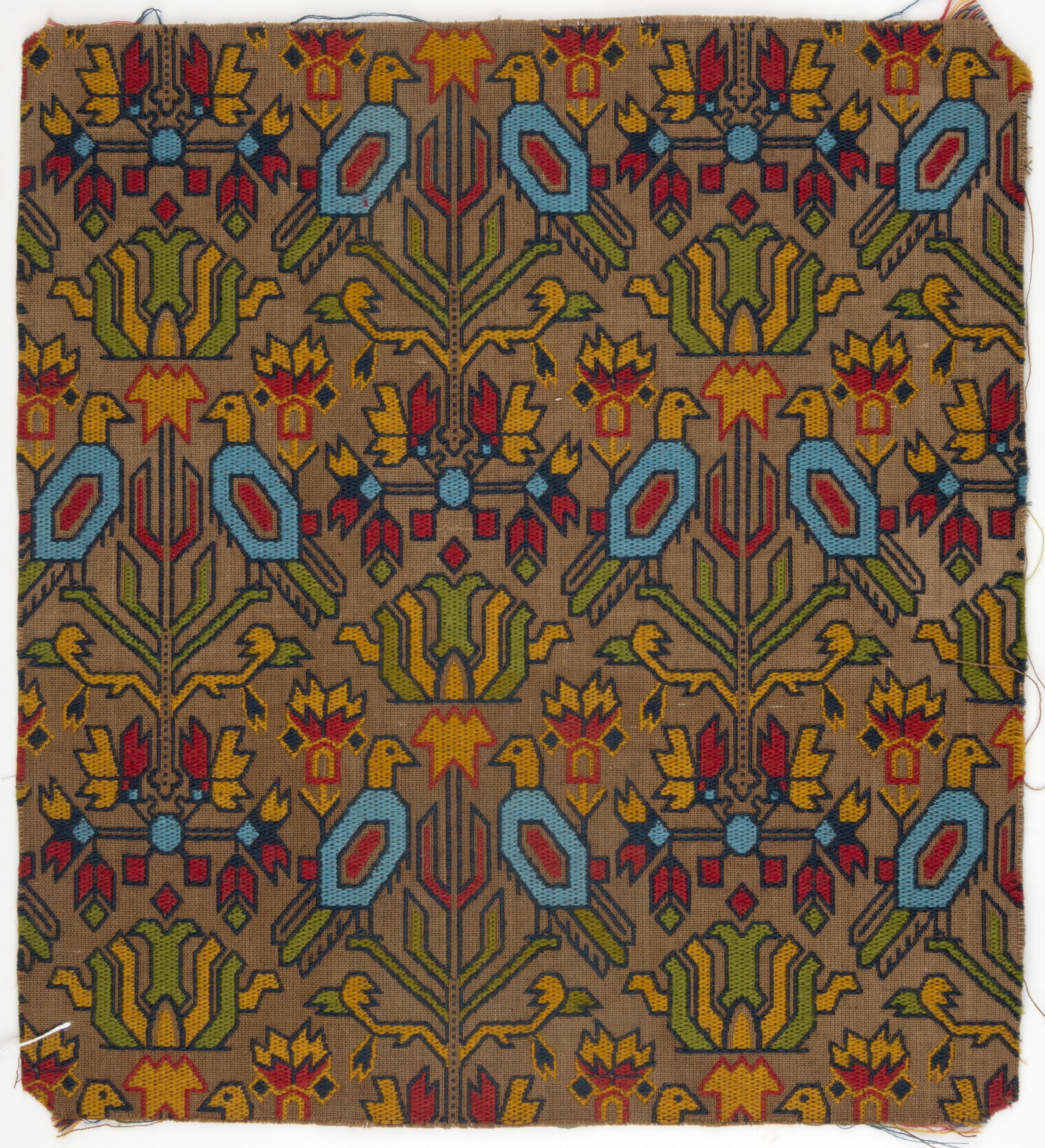 fabric swatch, Möbelstoffmuster; geometrischens Muster mit Vogelpaaren bunt auf braunem Grund, Philipp Haas & Söhne, MAK Inv.nr. TGMZ 2695