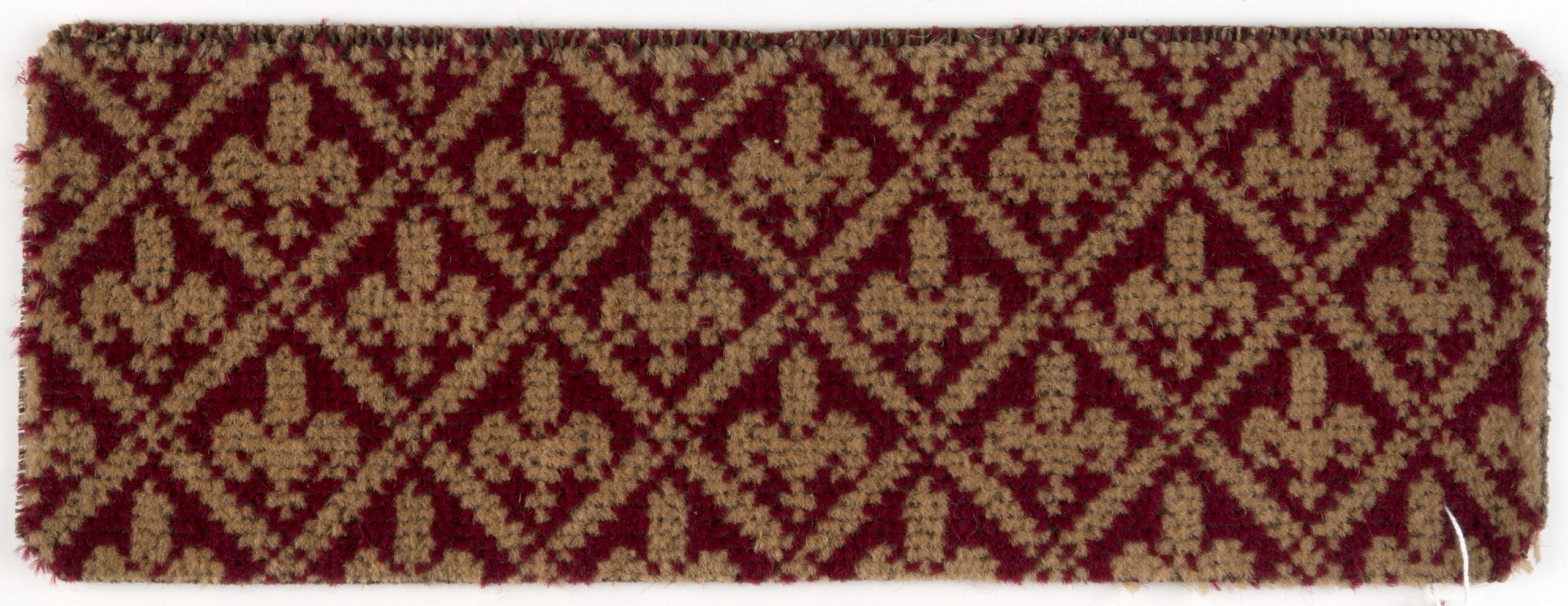 fabric swatch, Möbelstoffmuster; Rautenmuster mit fleur de lis in beige auf weinrotem Grund, Philipp Haas & Söhne, MAK Inv.nr. TGMZ 2648