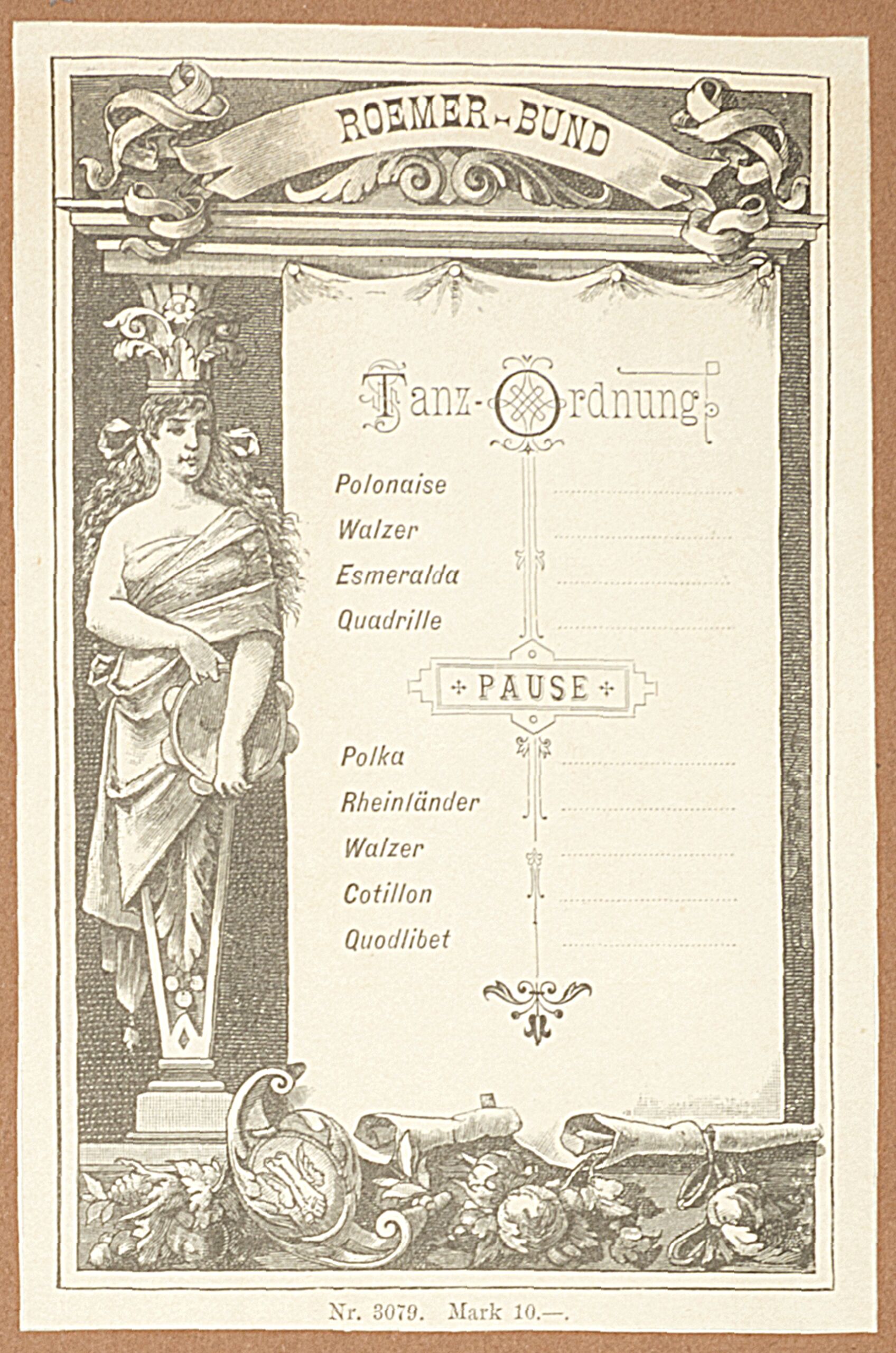 - text on object: Roemer-Bund / Tanz-Ordnung / Polonaise / Walzer / Esmeralda / Quadrille (...) / Nr. 3079. Mark 10.-.