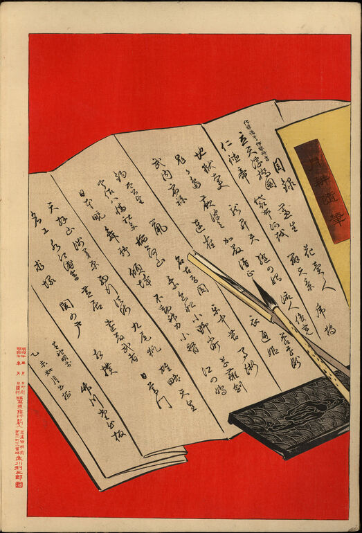Blatt aus einem Album mit Gekkōs Serie “Gekkō zuihitsu 月耕随筆”. Neunschwänziger Fuchs (kyūbi no kitsune 九尾の狐, auch kyūbiko 九尾狐) in den Kleidern einer Frau. Vielleicht wird hier die Umwandlung einer Frau zurück in einen Fuchs (vgl. Kuzunoha) gezeigt. Die durchscheinenden Kleider lassen die Beine und die neun Schwänze des Fuchs erkennen.