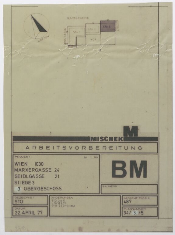 - text on object (rechts oben) : [Vorderseite:] "PZ. 1. / WERKBUNDAUSSTELLUNG / STUTTGART / 1927. / 2 HÄUSER, TYPE W-E-C. / BLOCK 21 & 22. / 1:50. / WIEN, IM JÄNNER 1927."[Rückseite:] "KI 23126-2"