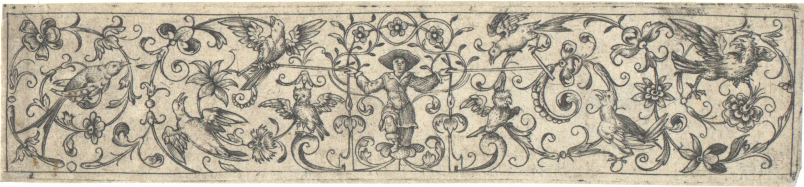 ornamental engraving, Ornamentfries mit Vögeln und einem Vogelfänger, Blatt aus der Folge von neun Ornamentfriesen mit Pflanzenwindungen und Tieren., Hieronymus Bang, MAK Inv.nr. KI 1653-3