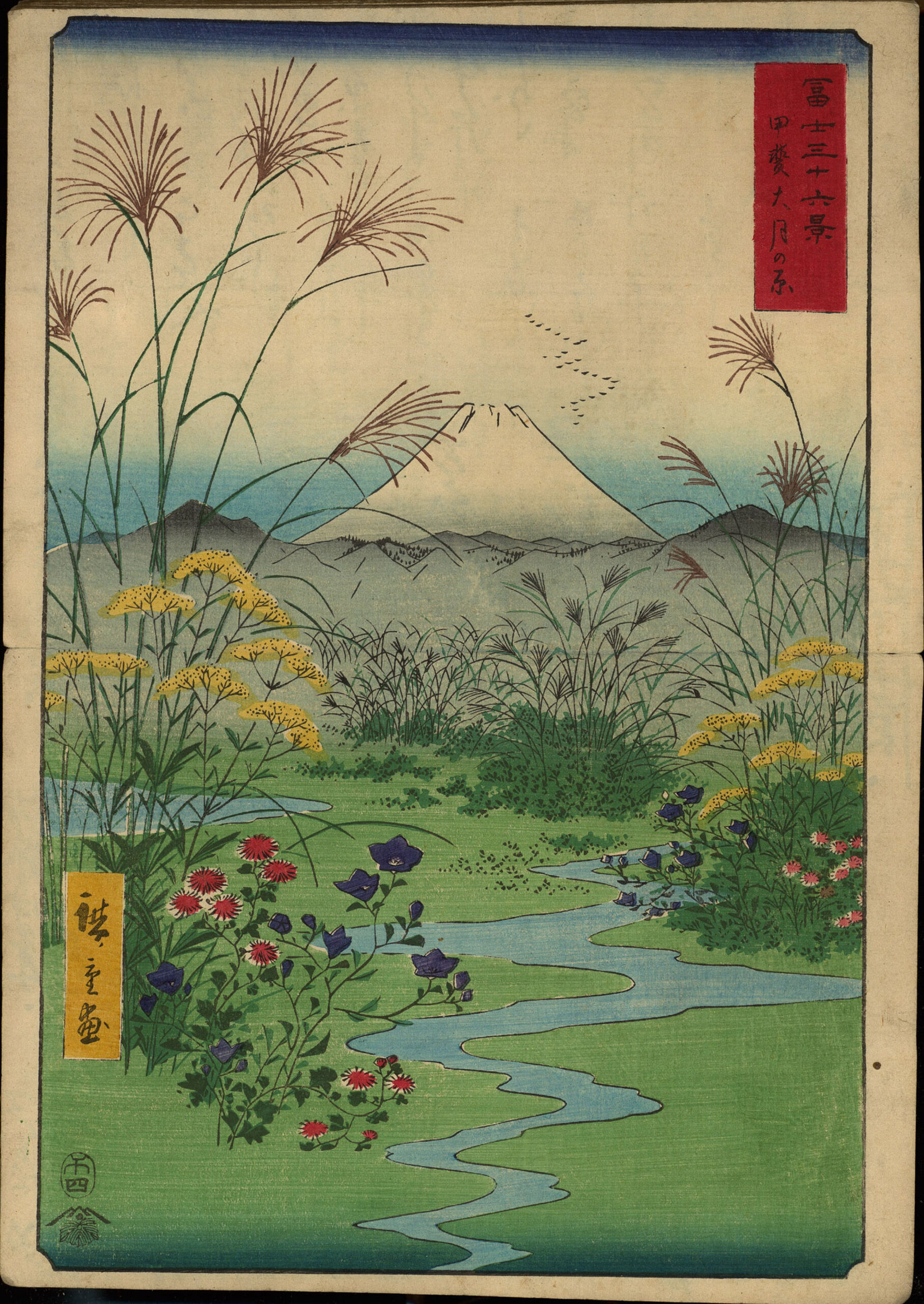 Serie der 36 Ansichten vom Berg Fuji von Hiroshige. Blick auf den Fuji von Ōtsukinohara 大月の原 aus. Herbststimmung. Verschiedene Herbstgräser wachsen auf der Wiese: Pampasgras (susuki), Goldbaldrian (ominaeshi), Ballonblumen (kikyō).... Das Bild hier mit einer gelben Signatur-Kartusche. Vgl. dazu Bemerkung bei BI 17426-2-1.