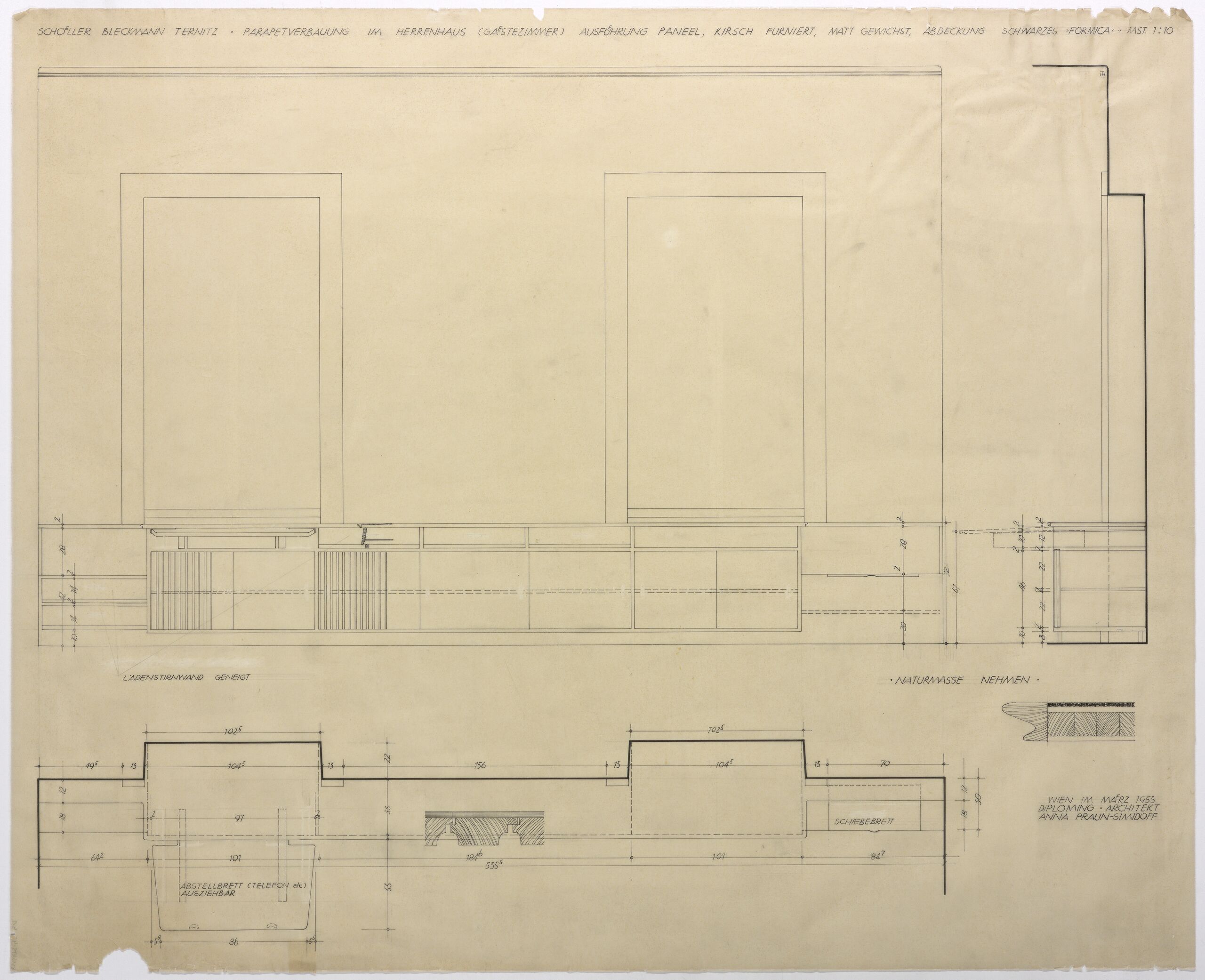 - text on object (oben) : SCHOELLER-BLECKMANN PARAPETVERBAUUNG IM HERRENHAUS (GÄSTEZIMMER) AUSFÜHRUNG PANEEL, KIRSCH FURNIERT, MATT GEWICHST ABDECKUNG SCHWARZES FORMICA MST 1:10