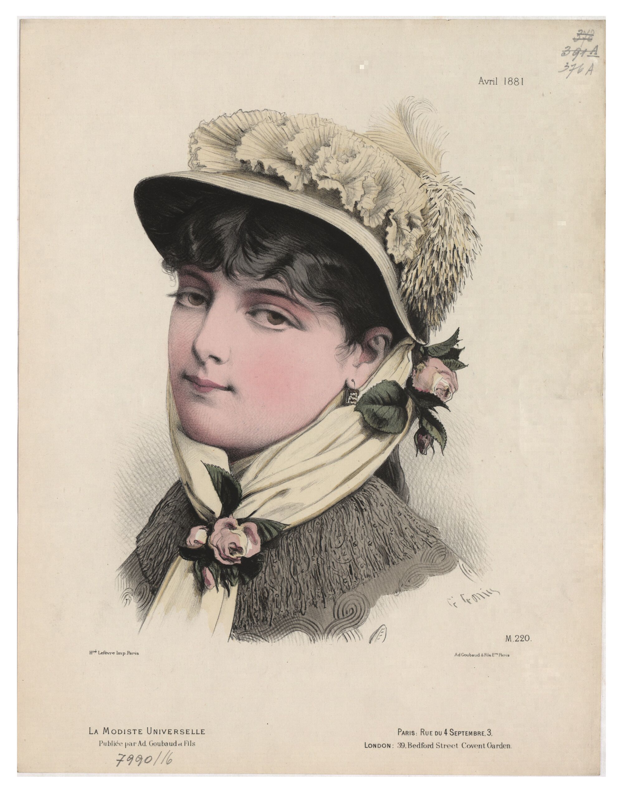 - text on object: [Links unten:] Hré. Lefèvre Imp. Paris / La Modiste Universelle / Publiée par Ad. Goubaud et Fils [Rechts oben:] Avril 1881 [Rechts unten:] G. Gonin / M. 220. / Ad. Goubaud & Fils Ers. Paris / Paris: Rue du 4 Septembre, 3, / London: 39, Bedford Street Covent Garden. [Gedruckter Text]