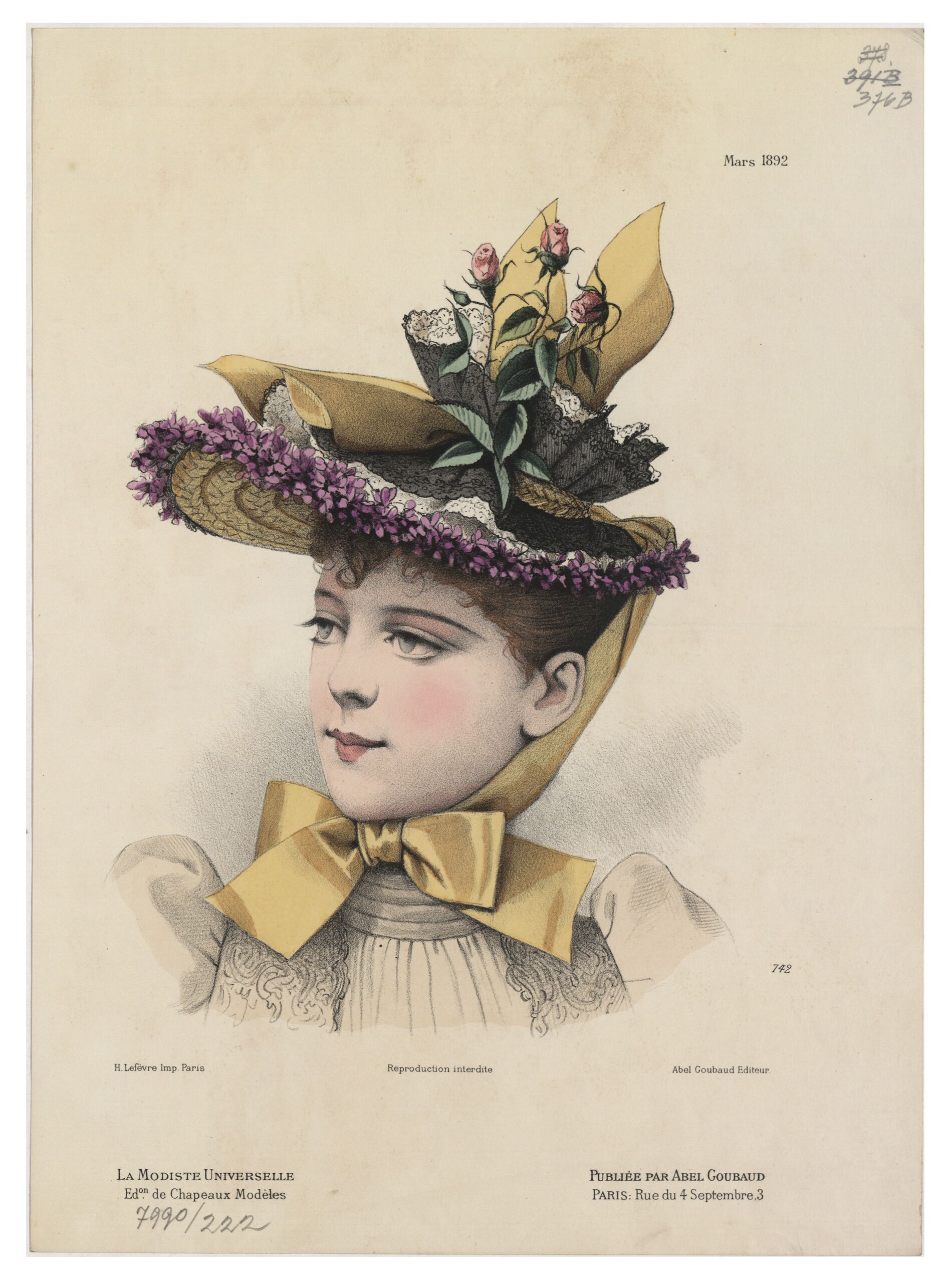 - text on object: [Links unten:] H. Lefèvre Imp. Paris / La Modiste Universelle / Edon. de Chapeaux Modèles [Unten in der Mitte:] Reproduction interdite [Rechts oben:] Mars 1892 [Rechts unten:] 742 / Abel Goubaud Editeur. / Publiée par Abel Goubaud / Paris: Rue du 4 Septembre, 3 [Gedruckter Text]