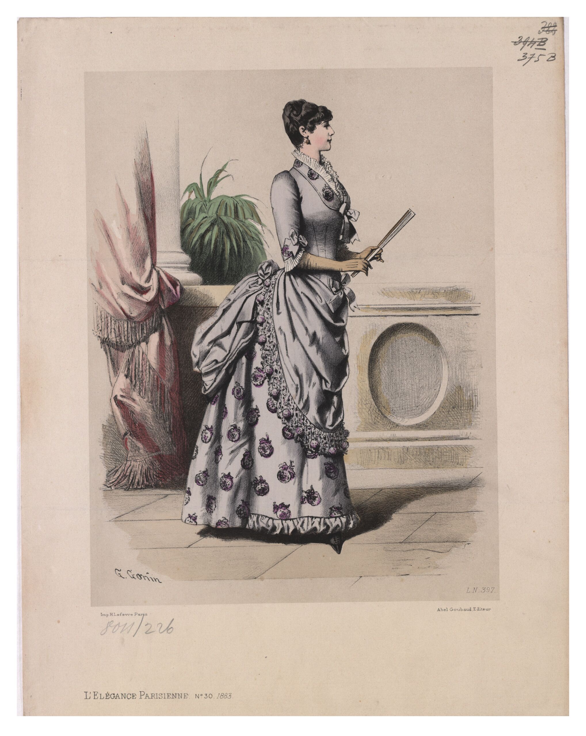 - text on object: [Links unten:] G. Gonin / Imp. H. Lefèvre, Paris. / L'Élégance Parisienne No. 30. 1883. [Rechts unten:] L.N. 397. / Abel Goubaud Editeur [Gedruckter Text]