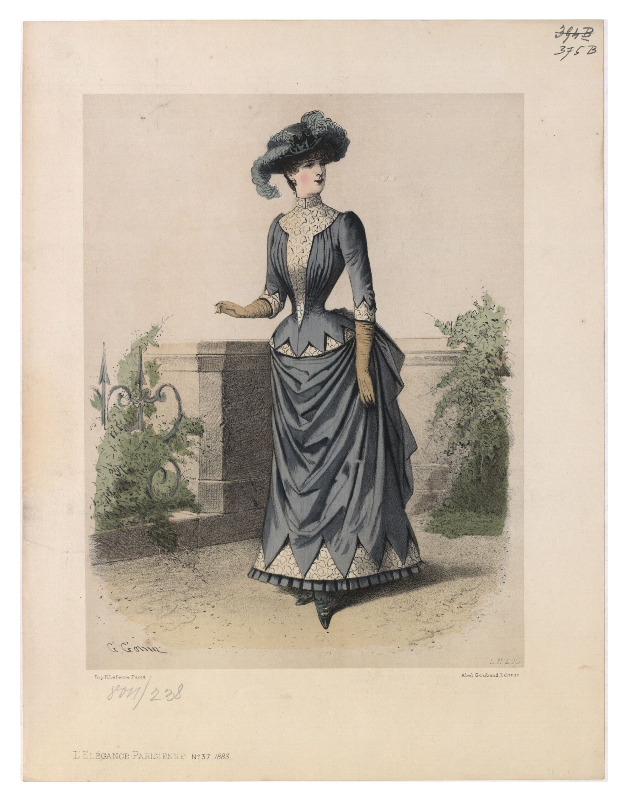 - text on object: [Links unten:] G. Gonin / Imp. H. Lefèvre, Paris. / L'Élégance Parisienne No. 37. 1883. [Rechts unten:] L.N. 403. / Abel Goubaud Editeur [Gedruckter Text]