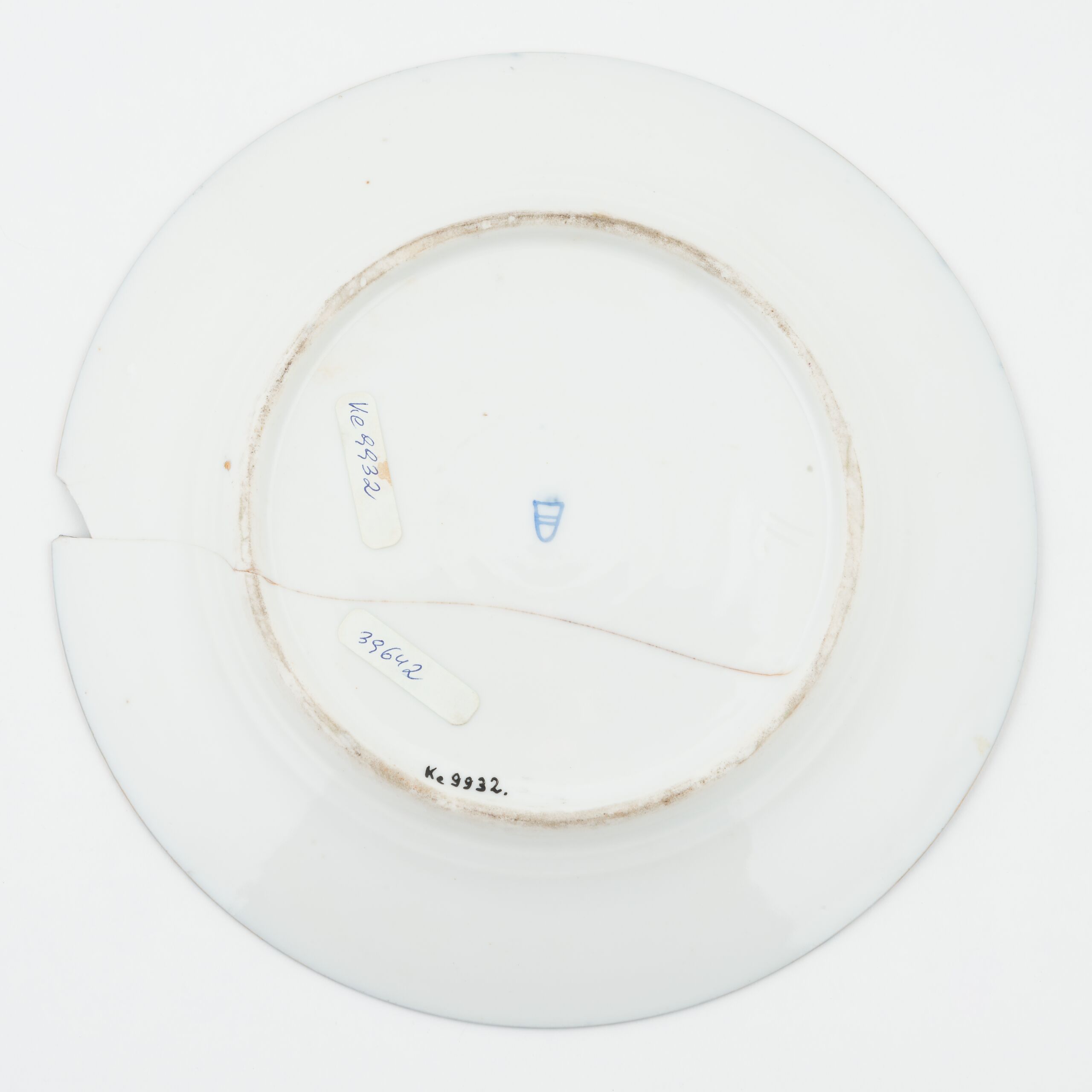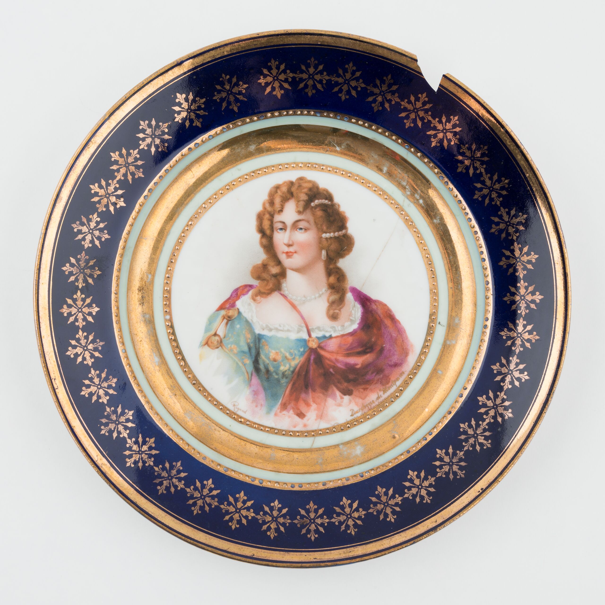 Teller mit Goldrändern, Kobaltblauer Fahne mit goldener Sternenbordüre, in der Kehle und am Spiegel goldfarbene Reliefperlenbordüre, Kehle mit breitem Goldrand, im Spiegel Abziehbild der Durchesse de Montpans bez. "Rigaud"