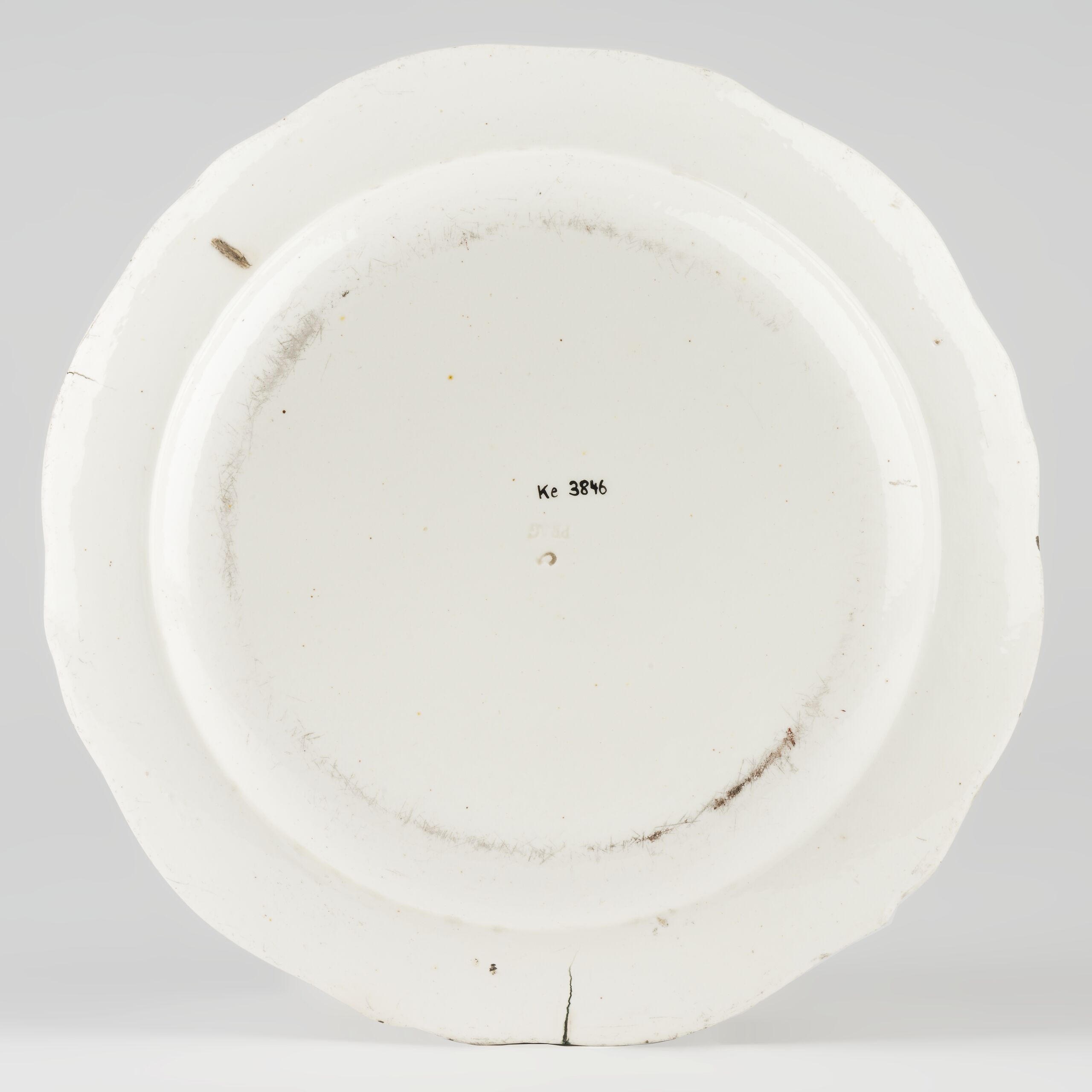 Teller mit gewelltem, umgeschlagenem Rand, Fahne mit einer farbig gemalten Blättchenbordüre, die durch rote Blumenknospen unterbrochen wird, auf dem Übergang Kehle zum Spiegel eine grün gemalte Wellenbordüre mit roten Fortsätzen, im Spiegel ein farbig gemaltes Blumenbukett mit einer großen Rose