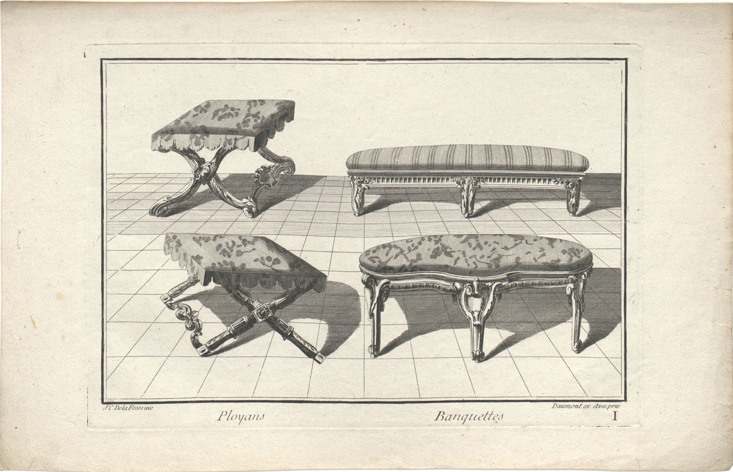 - text on object: Ployans, Banquettes / J C De la Fosse inv, Daumont ex Avec priv / I