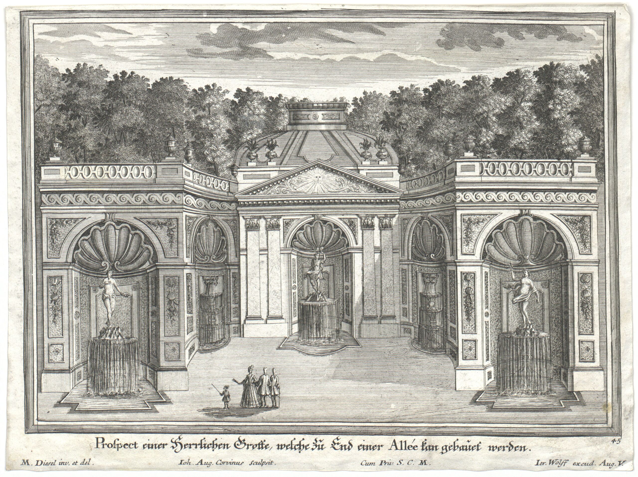 - text on object: Prospect einer Herrlichen Grotte, welche zu End einer Allee kan gebauet werden. / M. Diesel inv. et del., Ioh. Aug. Corvinus Sculpsit., Cum Priv. S. C. M., Ier. Wolff excud. Aug. V. / 45