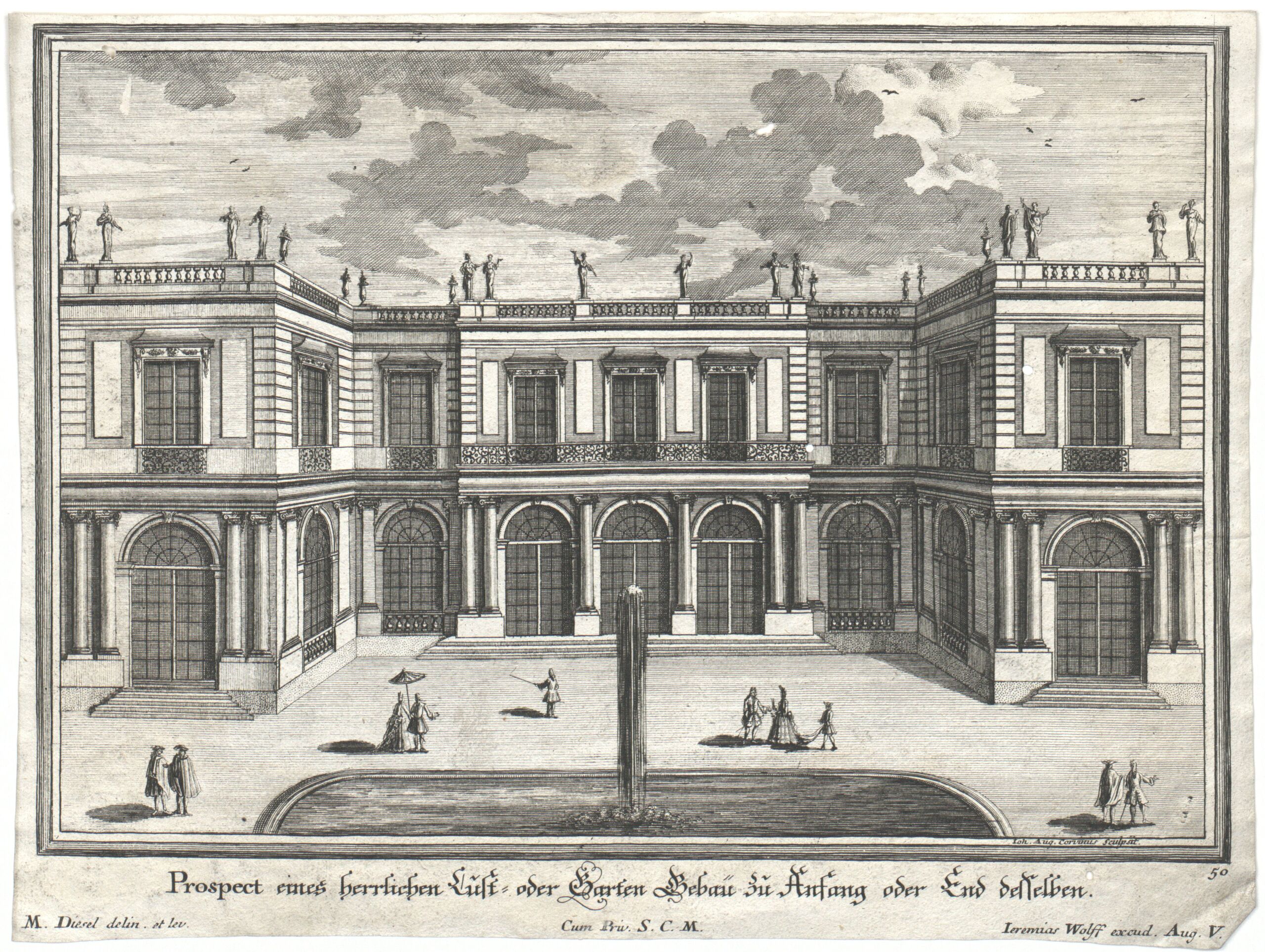 - text on object: Prospect eines herrlichen Lust- oder Garten Gebaü zu Anfang oder End desselben. / M. Diesel delin. et lev., Ioh. Aug. Corvinus Sculpsit., Cum Priv. S. C. M., Ieremias Wolff excud. Aug. V. / 50