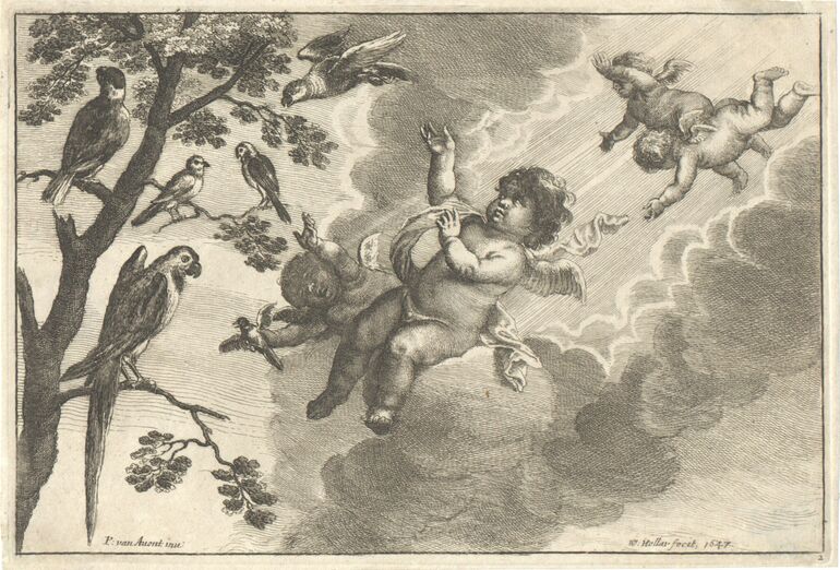 - Putti in den Wolken, Blatt aus der Folge der Kinderspiele mit dem Titel „Paedo Paegnioni sine Puerorum Ludentum Schemata Varia etc.“, (Gustav Parthey Nr. 505) (given title)