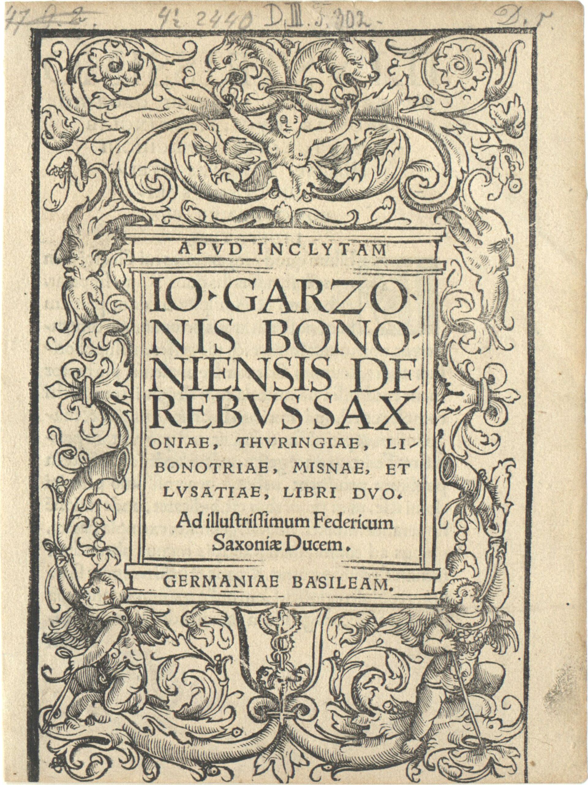 - text on object: APUD INCLYTAM GERMANIAE BASILEAM / IO. GARZO/ NIS BONO/ NIENSIS DE/ REBUS SAX/ ONIAE ...