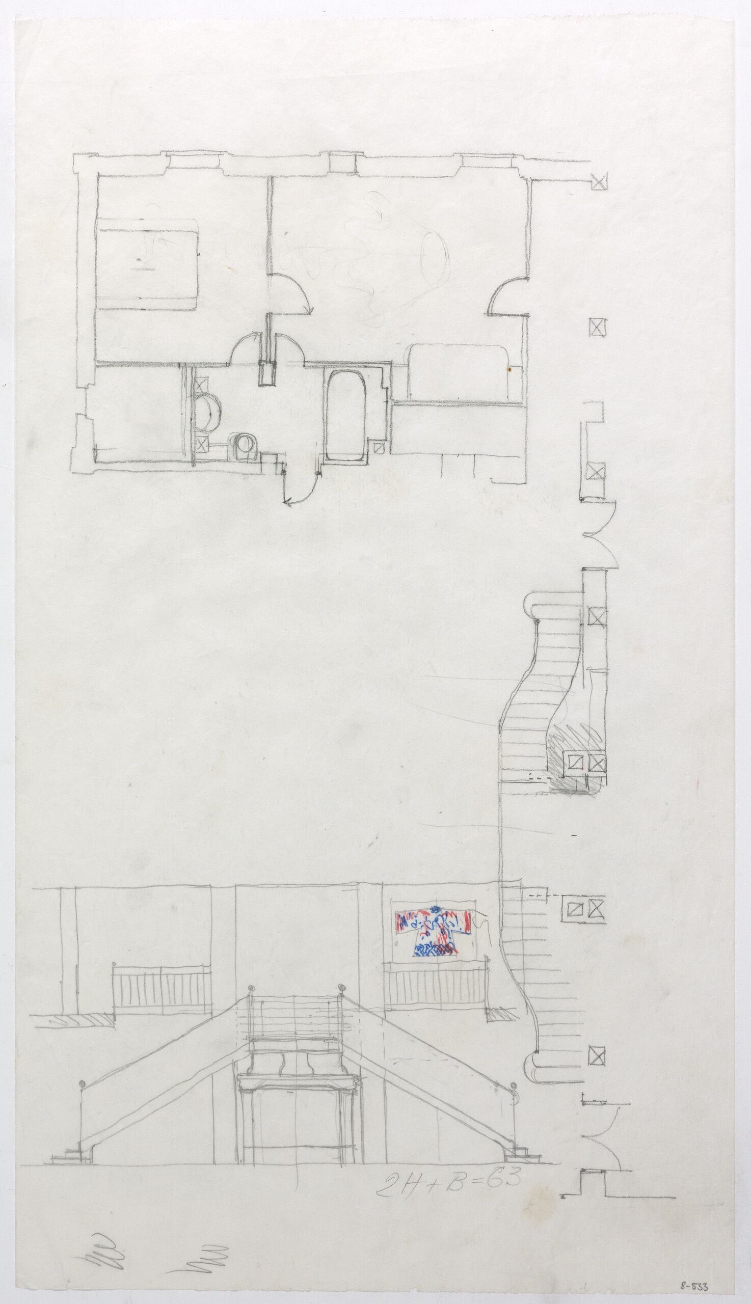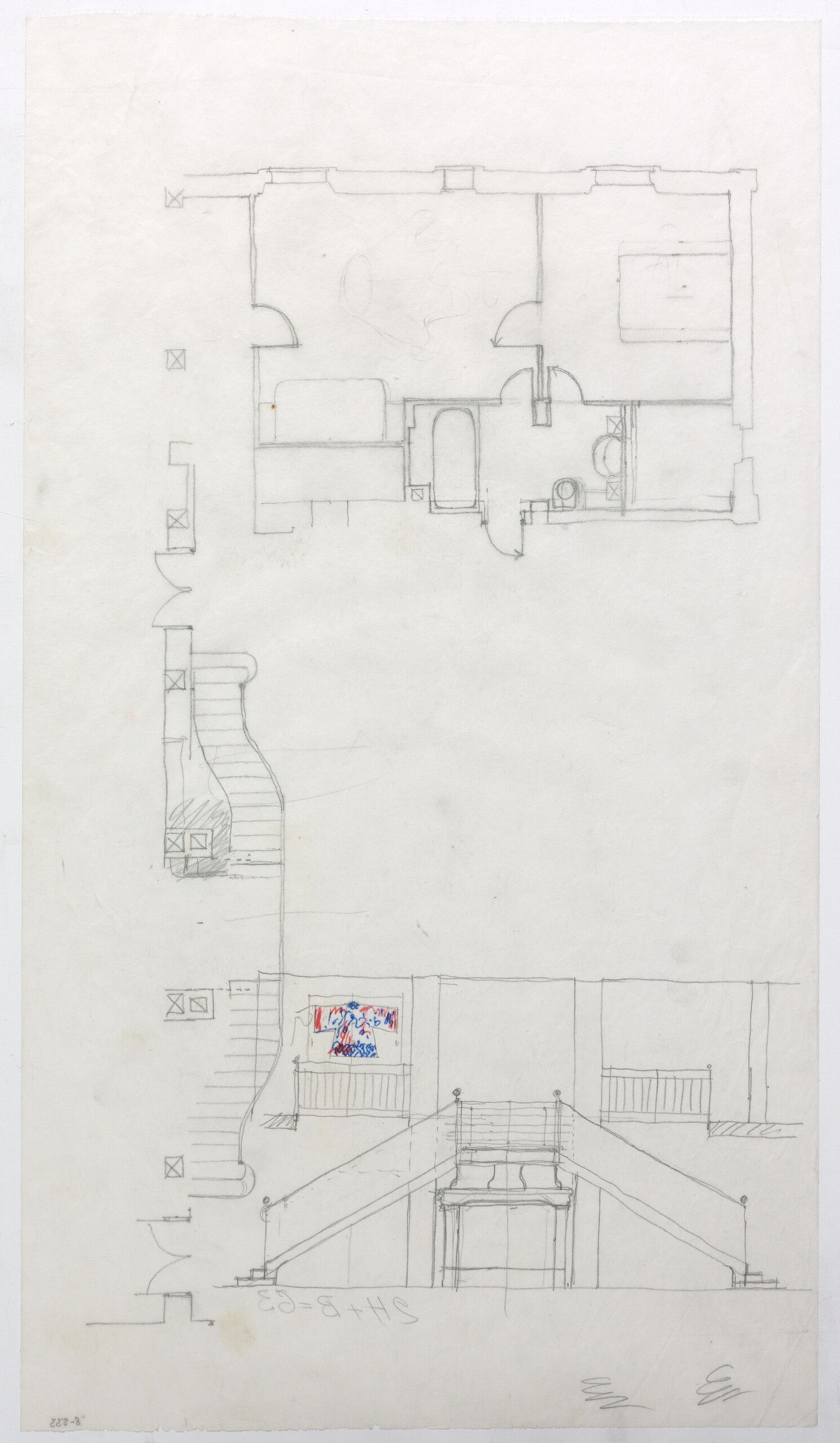 - Recto Frontalansicht der Doppelstiege und des Kamins im Wohnzimmer, Verso Grundriss der Doppelstiege und von Zimmern (given title)
