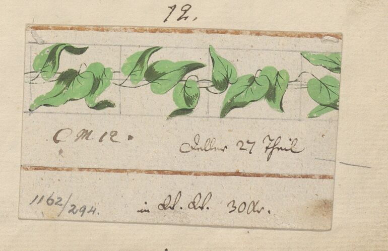 - Reinzeichnung und zwei punktierte Pausen für einen Polster (Kissen) mit Felderteilung und stilisierten Pflanzen