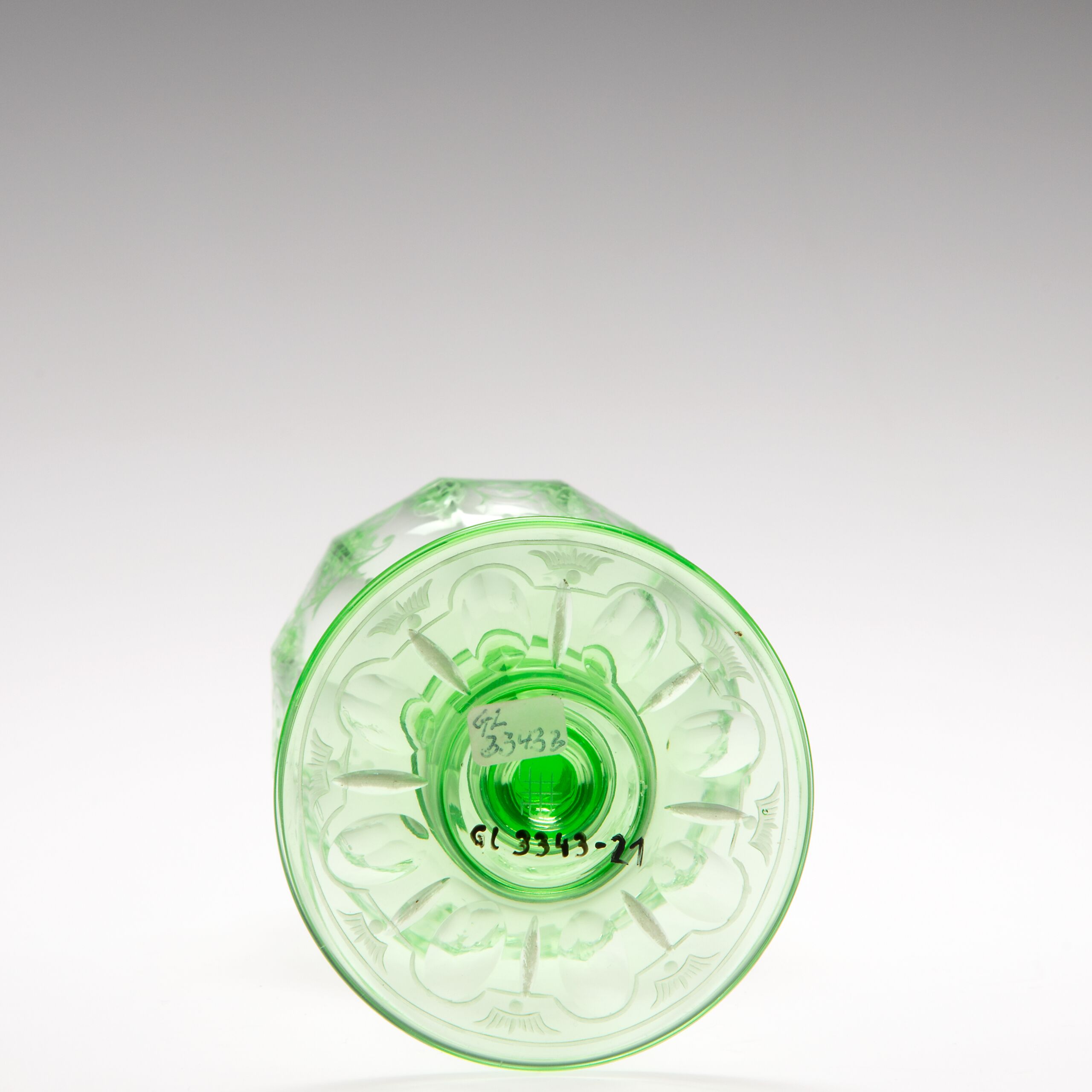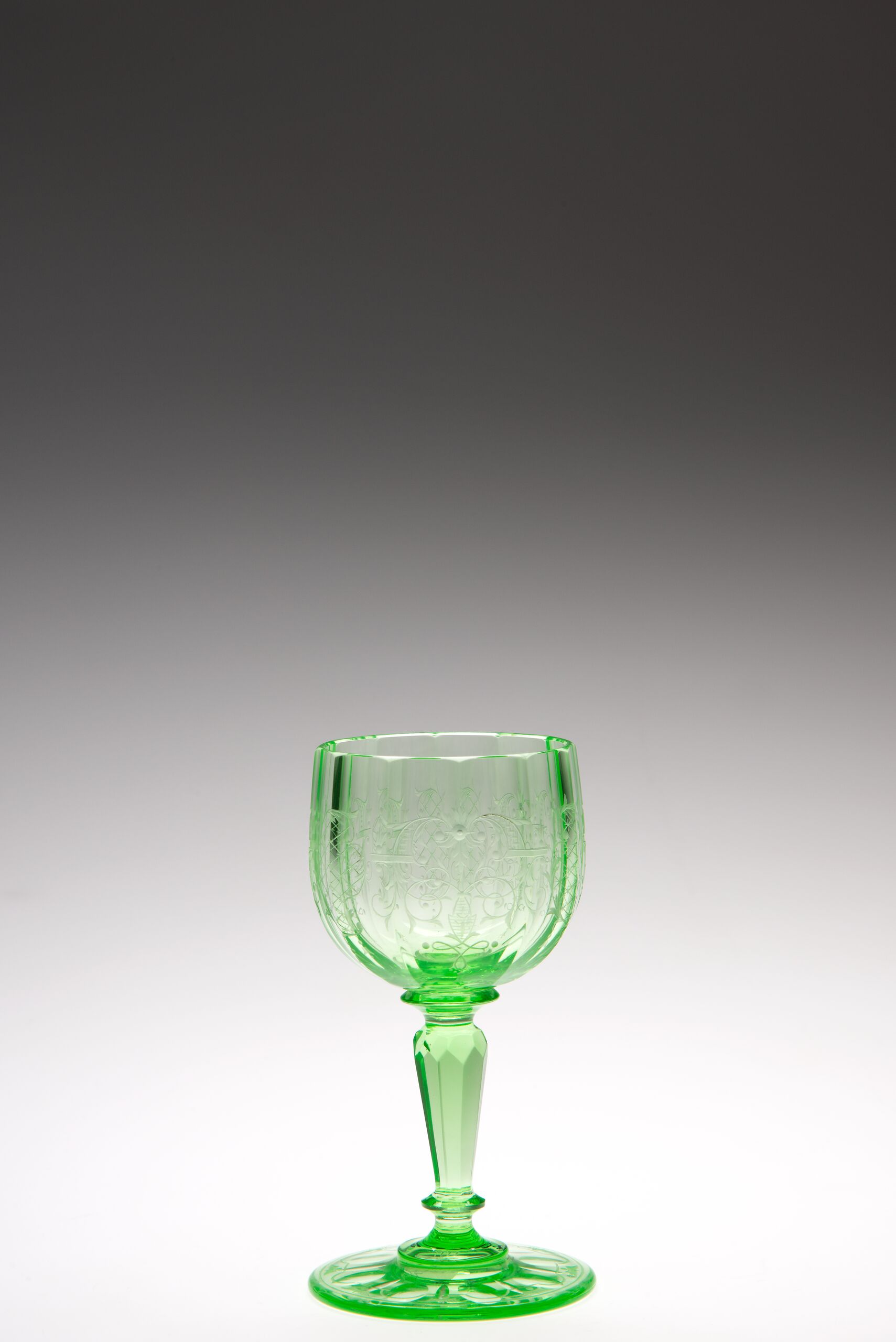 reich ornamentiert, geschliffen und graviert, grün, zwölfeckig geschliffener tulpenförm. Kelch auf facettiertem Schaft, runde Fussplatte