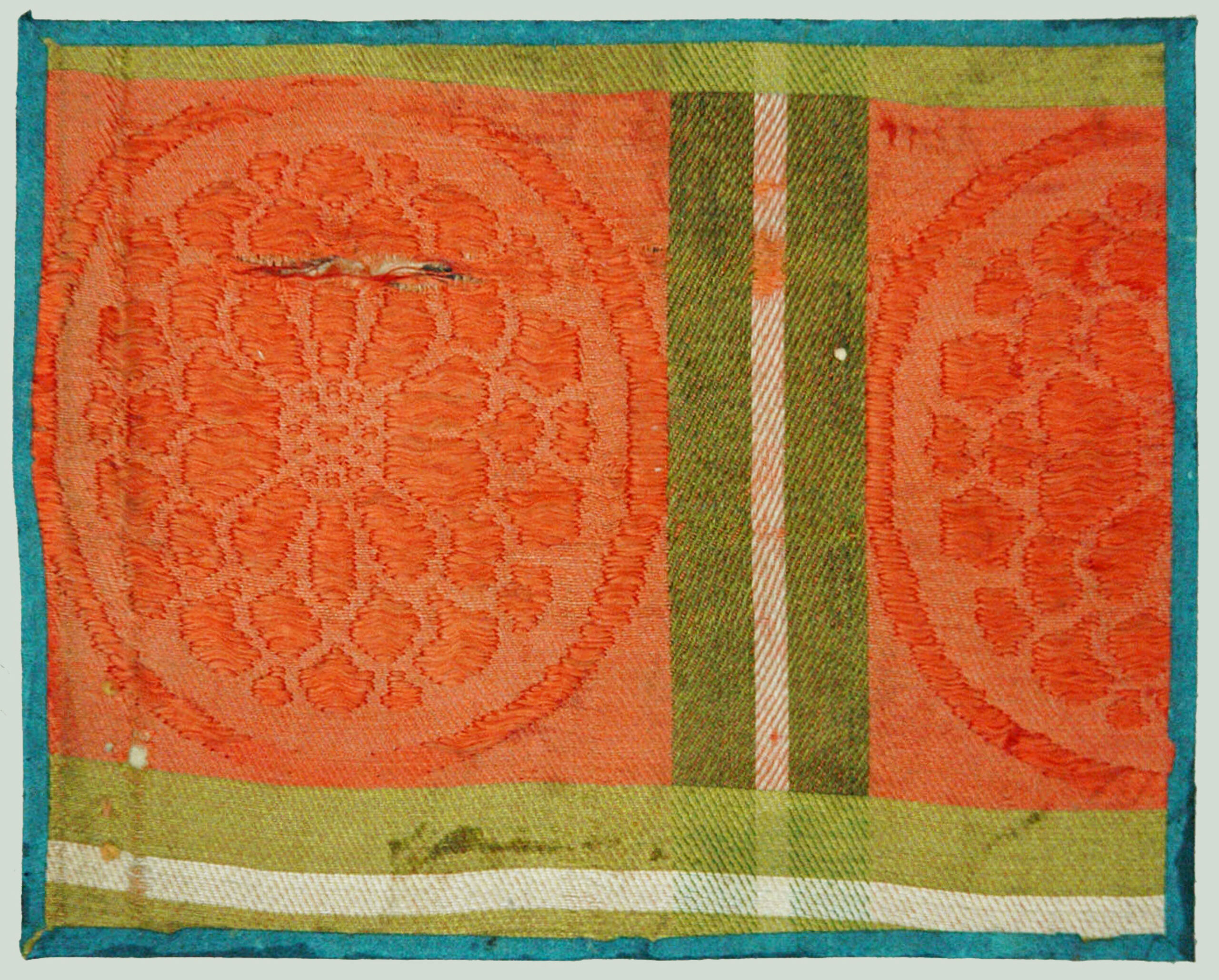 - Rosette in orangerot zwischen grün/weißem Karo (descriptive title)