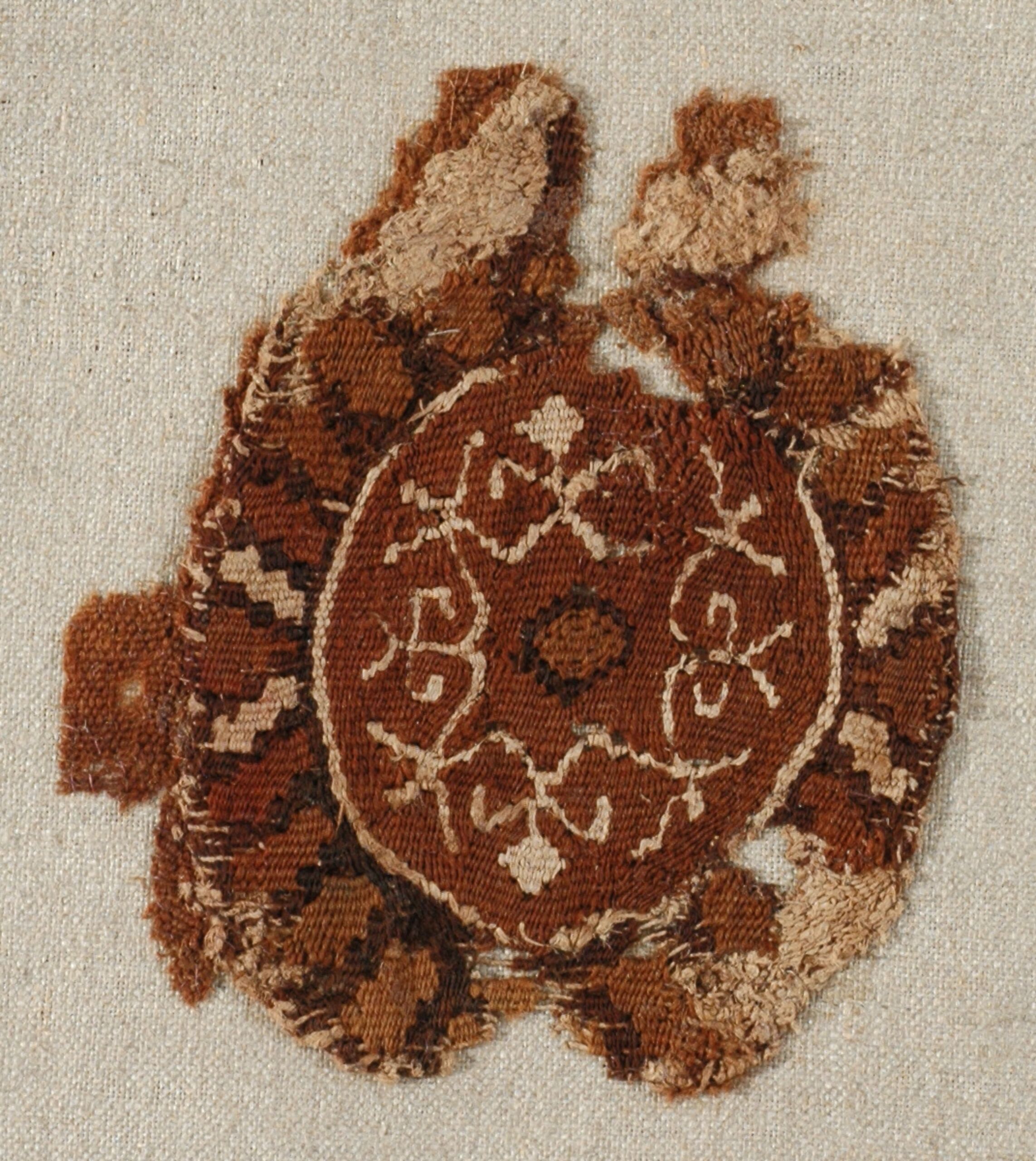 woven textile fragment, Roundel (orbiculus) on remnants of woollen textile; stylised pattern, cloisonné-type framing, Anonym, MAK Inv.nr. T 101