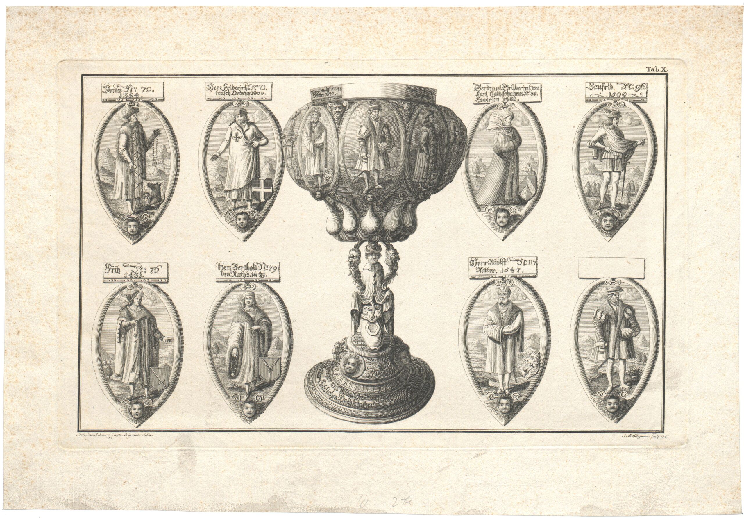 Druckgrafik, Rückseite eines Pokals mit Portraitfiguren der Familie Holzschuher, aus Gatterer’s Genealogie der Familie Holzschuhe, Johann Jakob Schwarz, MAK Inv.nr. KI 1-248-2