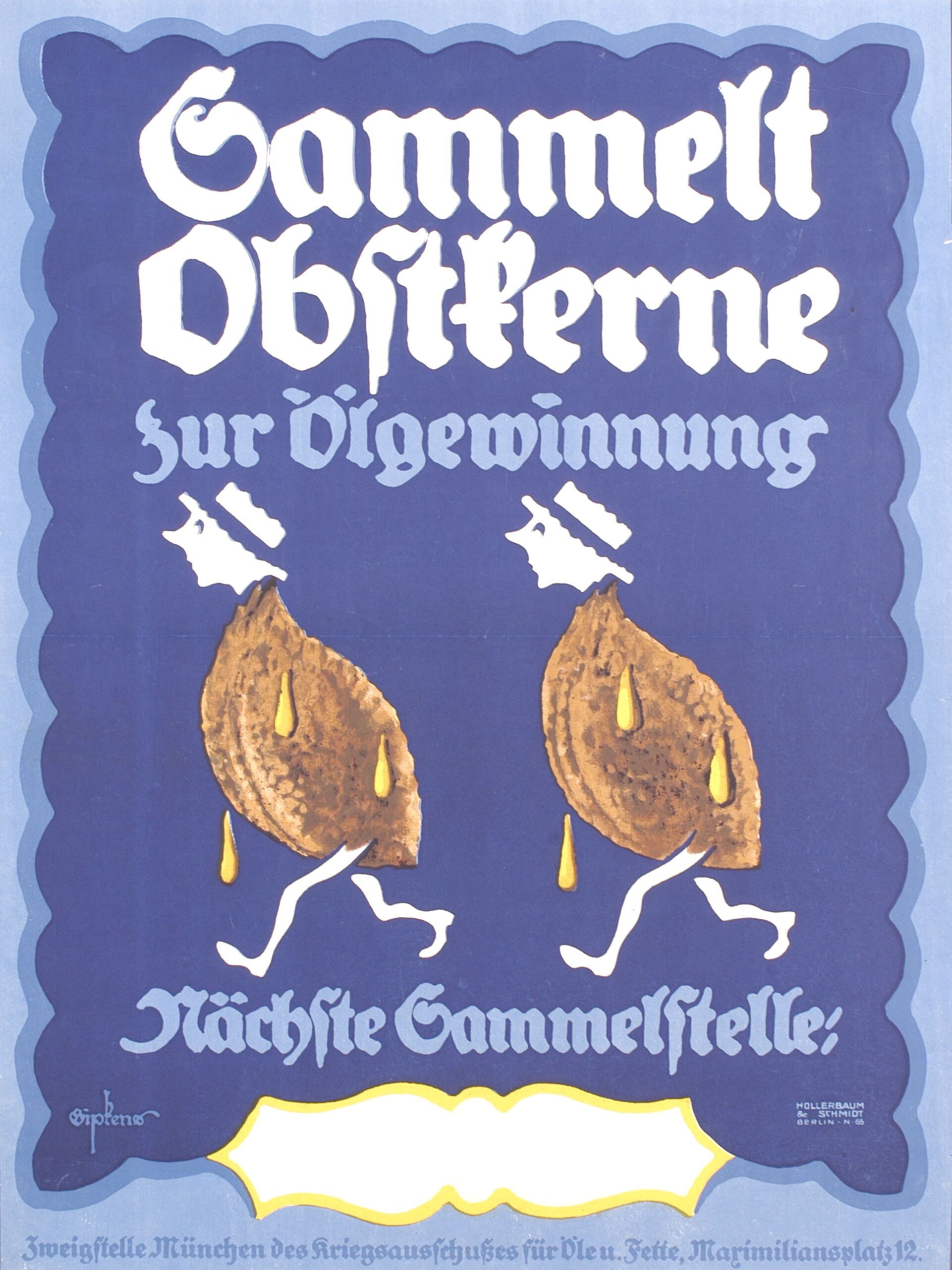 - text on object: Sammelt Obstkerne zur Ölgewinnung. Nächste Sammelstelle... Zweigstelle München des Kriegsausschußes für Öle und Fette, Maximiliansplatz 12.
