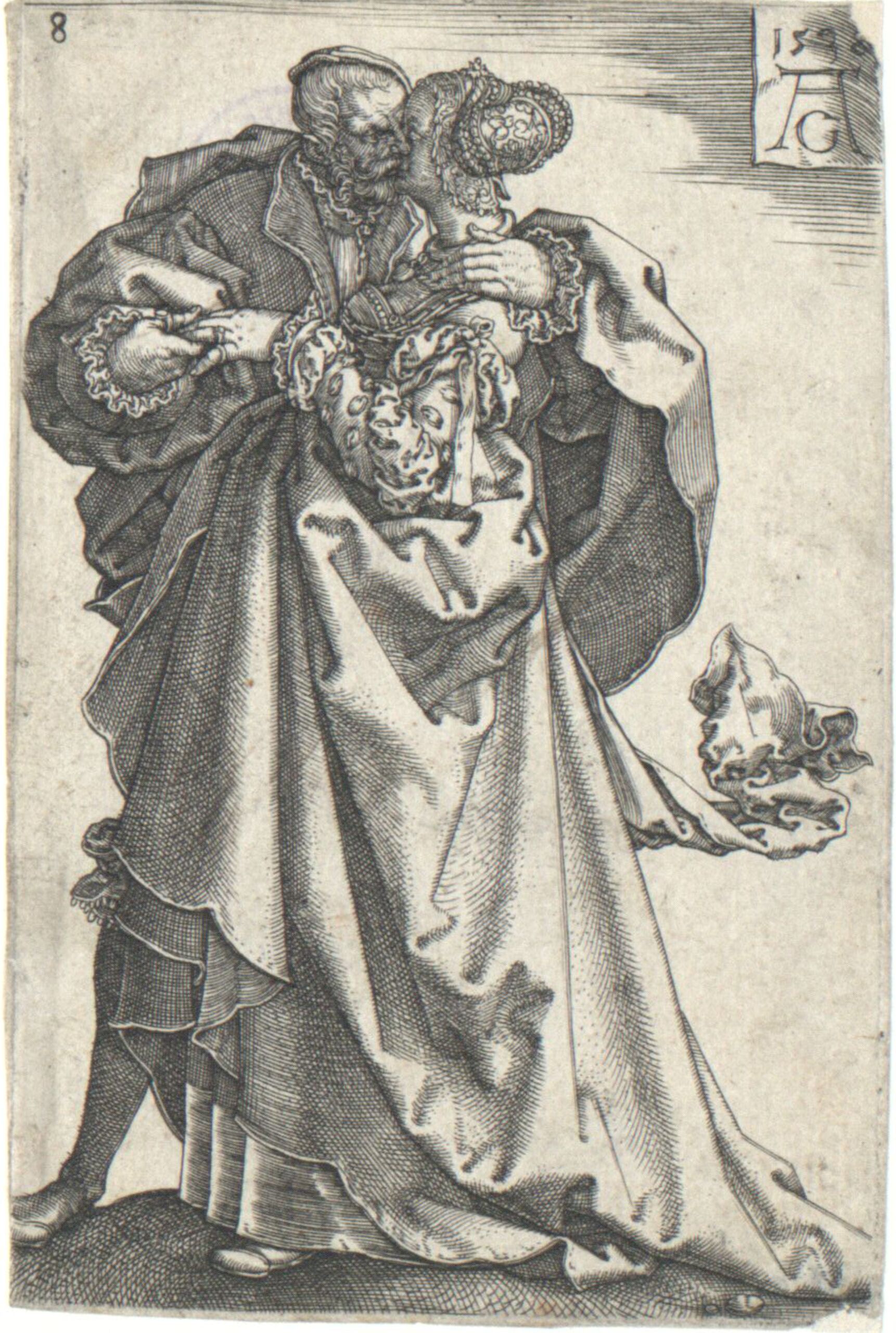 fashion plate, Sich küssendes Paar, Blatt 8 aus der Folge der großen Hochzeitstänze, Heinrich Aldegrever, MAK Inv.nr. KI 3674-8