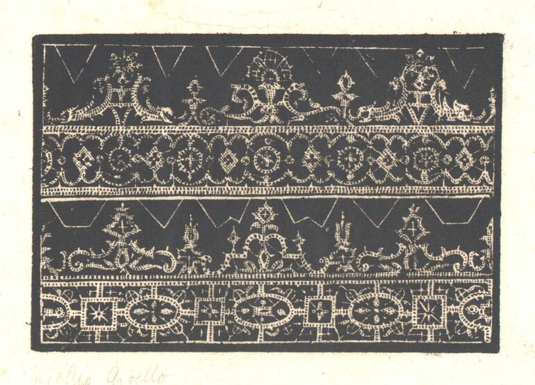 - Spitzenmuster, weiß auf schwarz aus der Folge „Corona delle Nobili et Virtuose Donne etc.“, herausgegeben von Cesare Vecellio, vgl. B. I. 2351 (K. I 16) (given title)