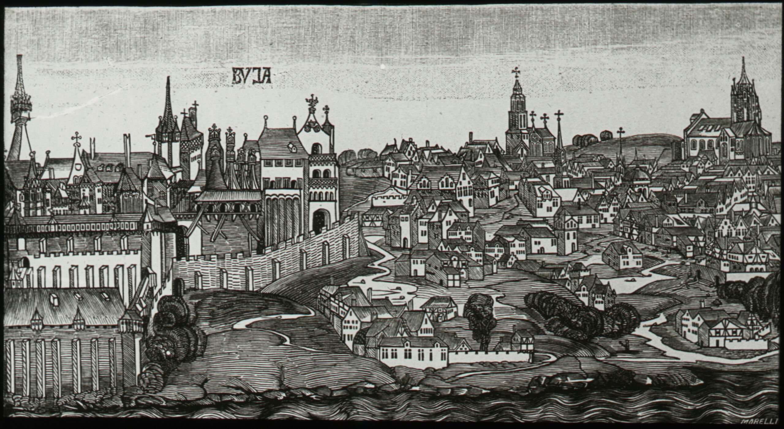 - text on object: Ansicht von Ofen um 1470. B. Reiffenstein, Wien, VIII. Bennogasse 24.