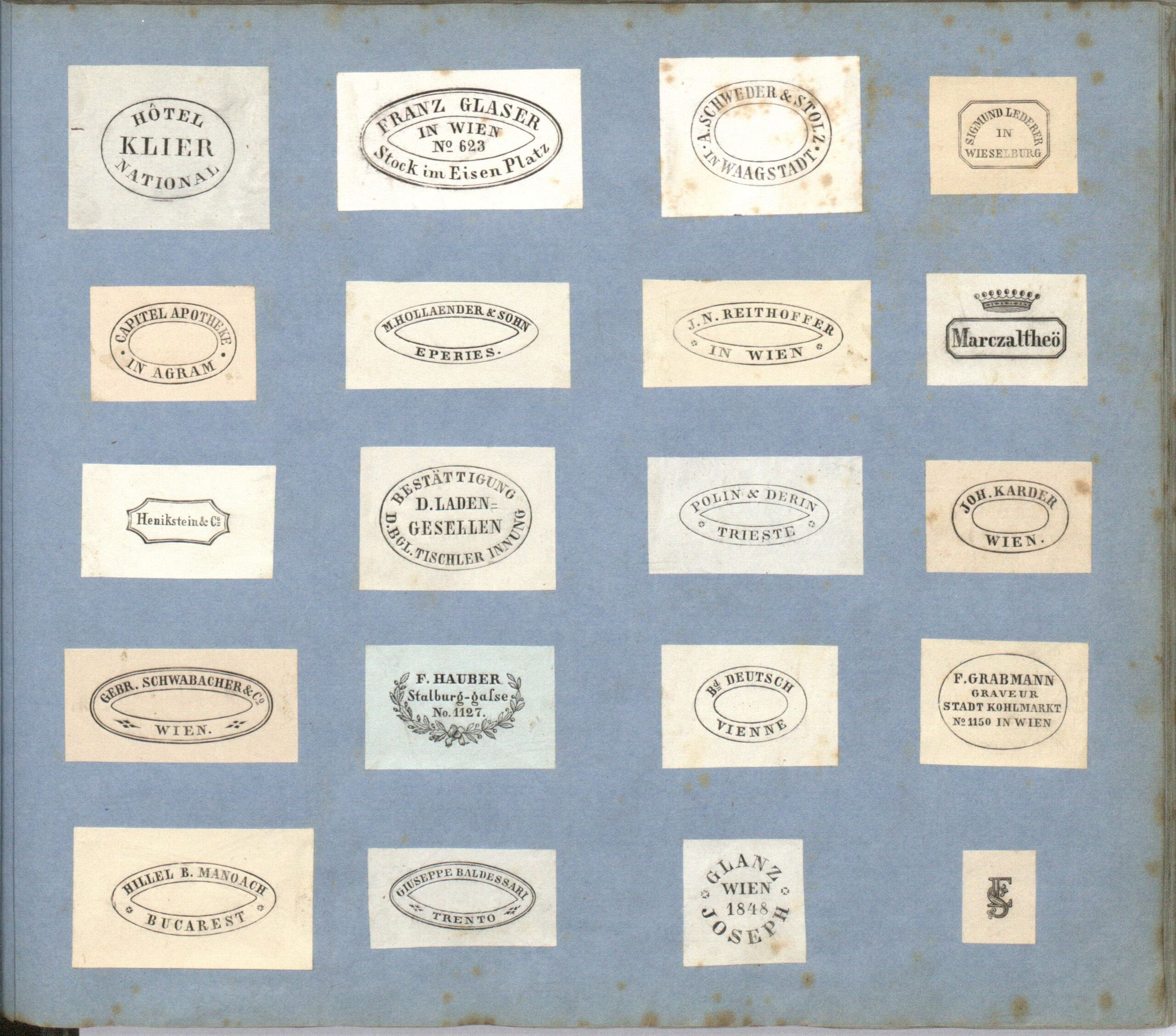 - aus einem Musterbuch mit einer Sammlung von Stempeln und Markenzeichen diverser Firmen, Institutionen und Privatpersonen des Graveurs Ferdinand Ahacic