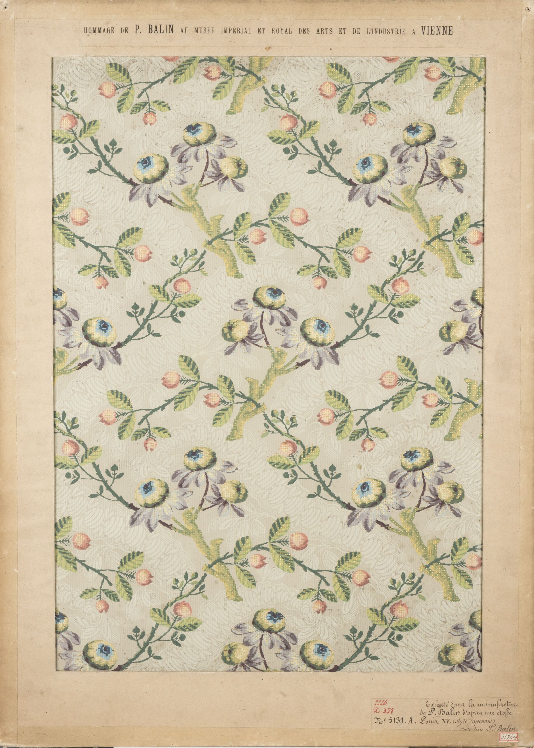- Etikett (Passepartout, Unterkante) : 2226Le 357 Exécuté dans la manufacture de P. Balin d'après une étoffe Louis XV (style Japonais)Collection P. Balin.N° 5131 A.