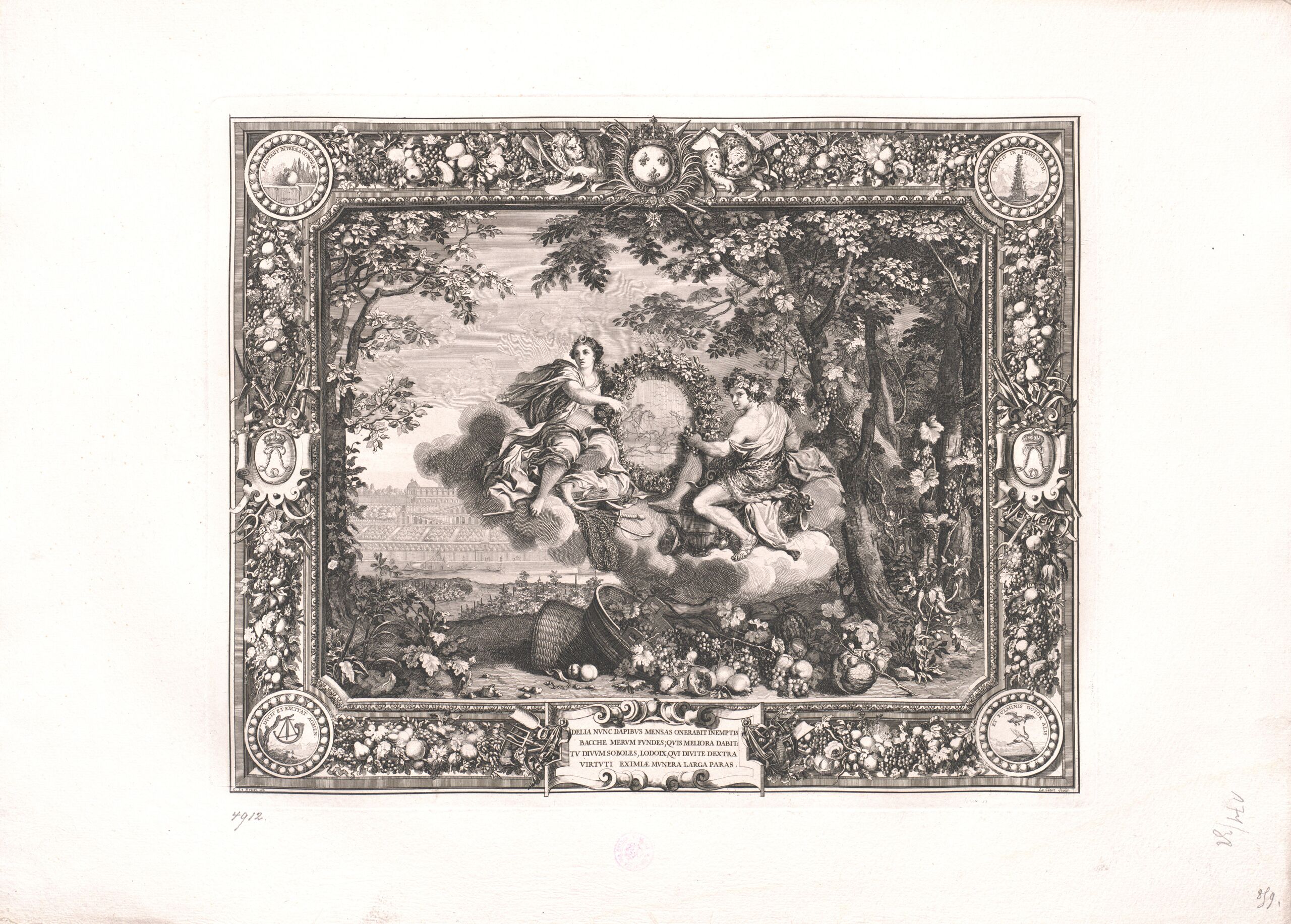 ornamental engraving, Tapisserie mit Delia und Bacchus, den Herbst repräsentierend, Blatt aus der Folge „Tapisseries du Roy ou sont representez les quatre Elemens et les quatre Saisons de L‘ Année“, Neudruck der Calcographie du Louvre, Paris, Charles Le Brun, MAK Inv.nr. KI 4912-27