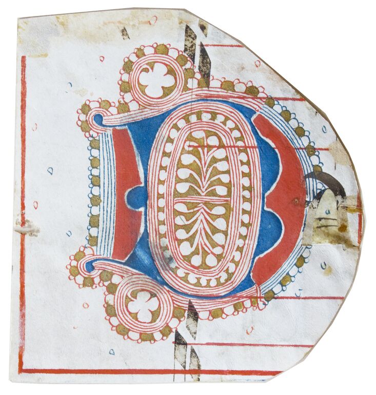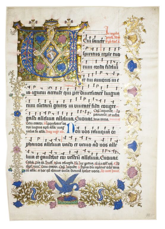 Teil eines Blattes einer Missale mit Initiale des Buchstabens "M" sowie einer Lombarde des gleichen Buchstabens darüber. Darunter und daneben wechseln Textur und Notation die Zeilen, wobei es sich um Quadratnotation auf vier Linien handelt. Die Filigraninitiale über zwei Zeilen ist mit Blüten geschmückt und bildet außen am Initialfeld ein leichtes Fleuronnée aus Perlen und stilisierten Blättern sowie die Randleiste entlang laufenden Fäden.